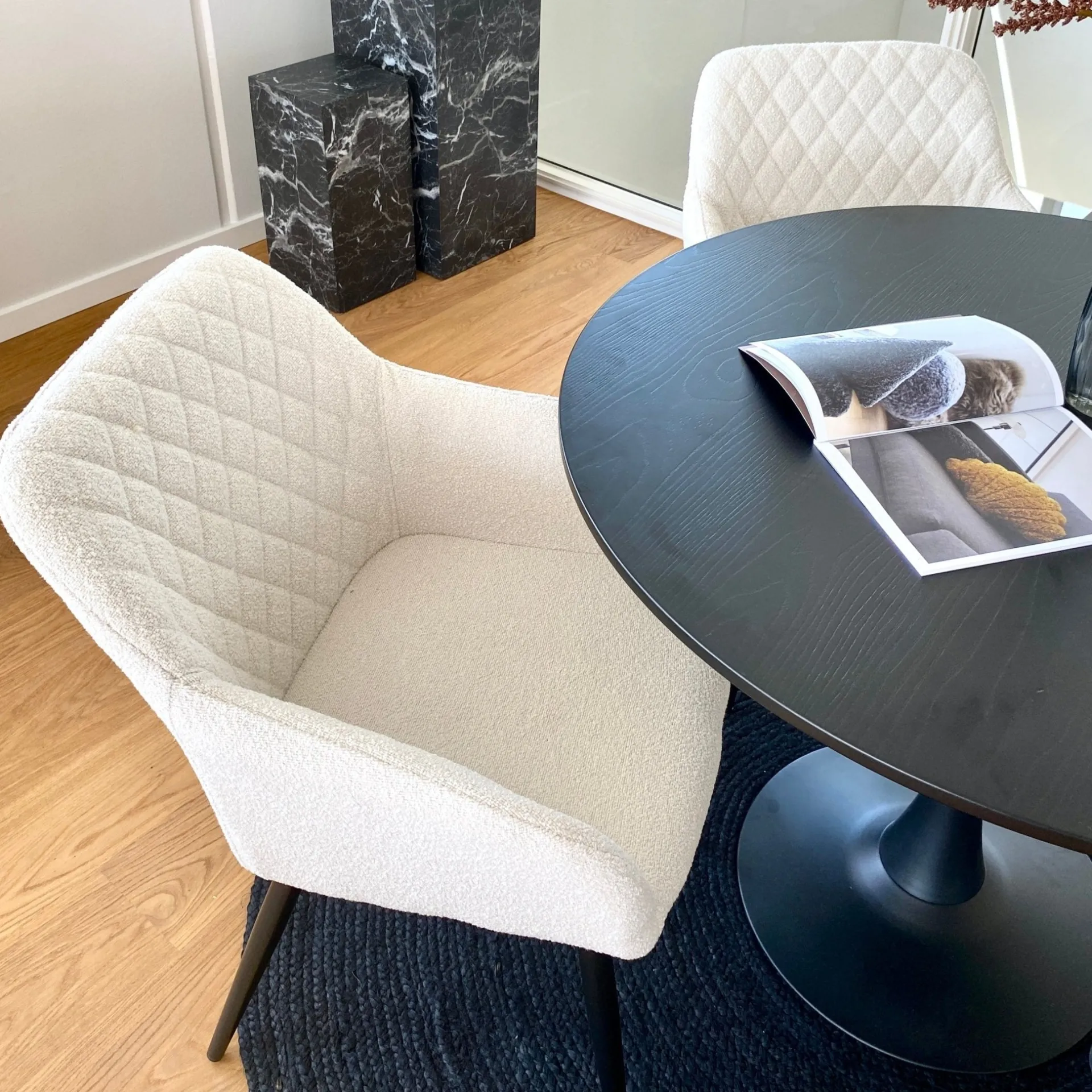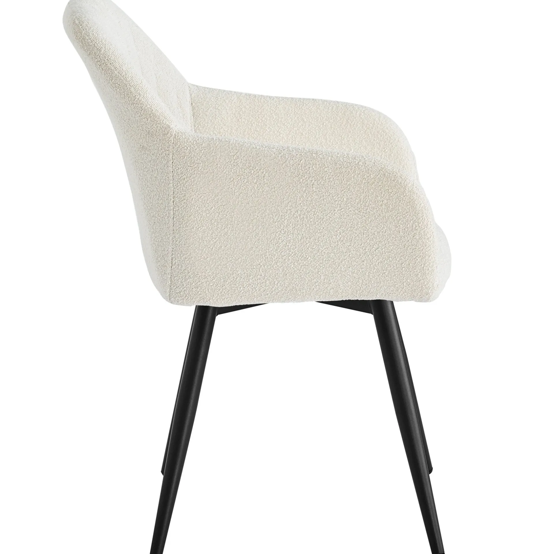 Carlo er en helt unik, rummelig og flot spisebordsstol med armlæn. Stolen er lavet af boucle og matte pulverlakeret ben, hvilket der sammen med størrelsen på stolen, gør den virkelig alsidig og både kan bruges som spisebordsstol, loungestol eller lænestol til stuen. Stolen er ydermere godt polstret, hvilket gør at siddekomforten er behagelig og man kan let sidde i mange timer uden at føle ubehag. Her er virkelig tale om en unik stol med armlæn, som ikke findes andre steder til samme pris. Stolen passer til alle vores spiseborde og kan skubbes helt ind under bordet. Carlo stolen kendes for sit flotte velour og god siddekomfort, men nu fås Carlo også i hvid boucle, som bringer varme og hygge ind i den moderne stil.