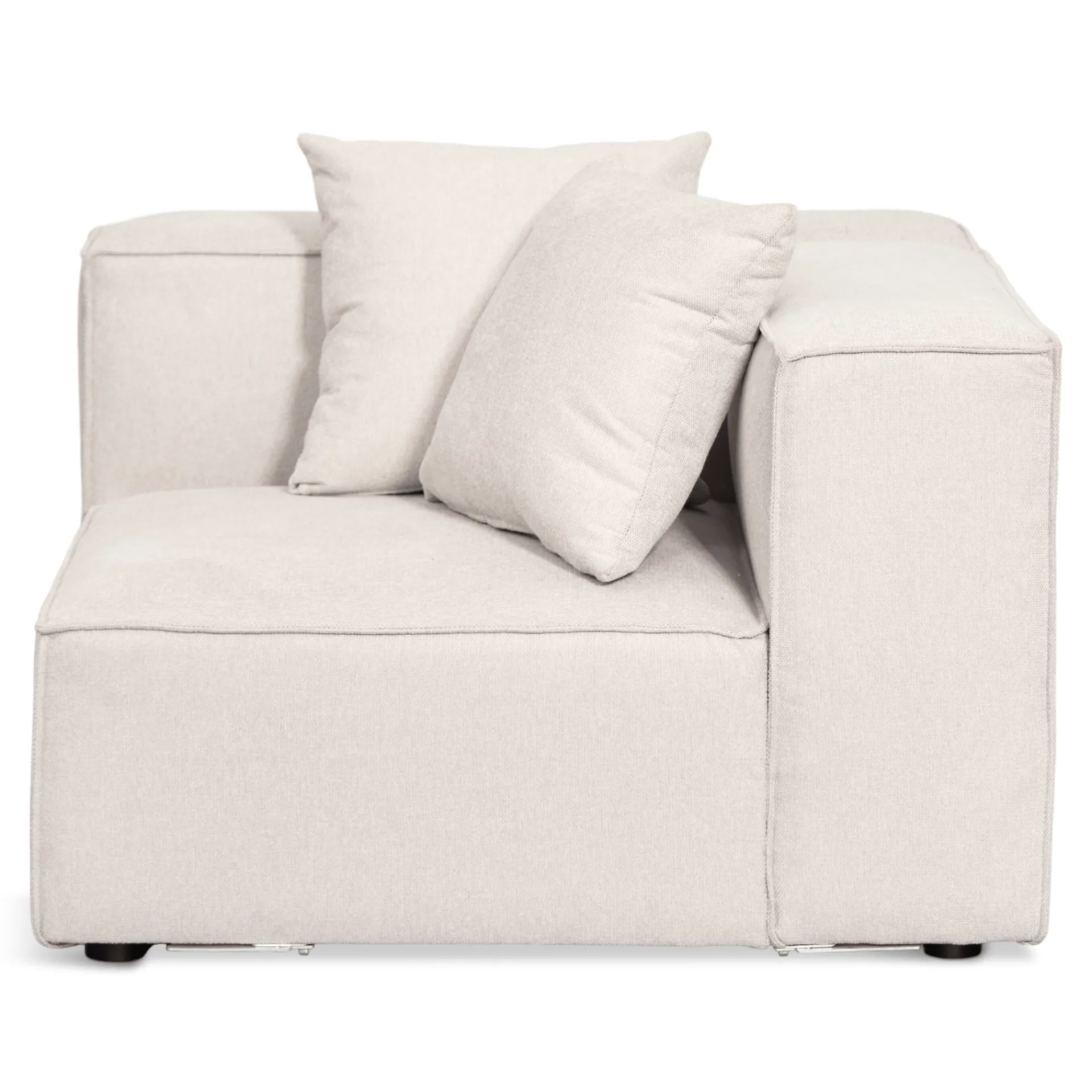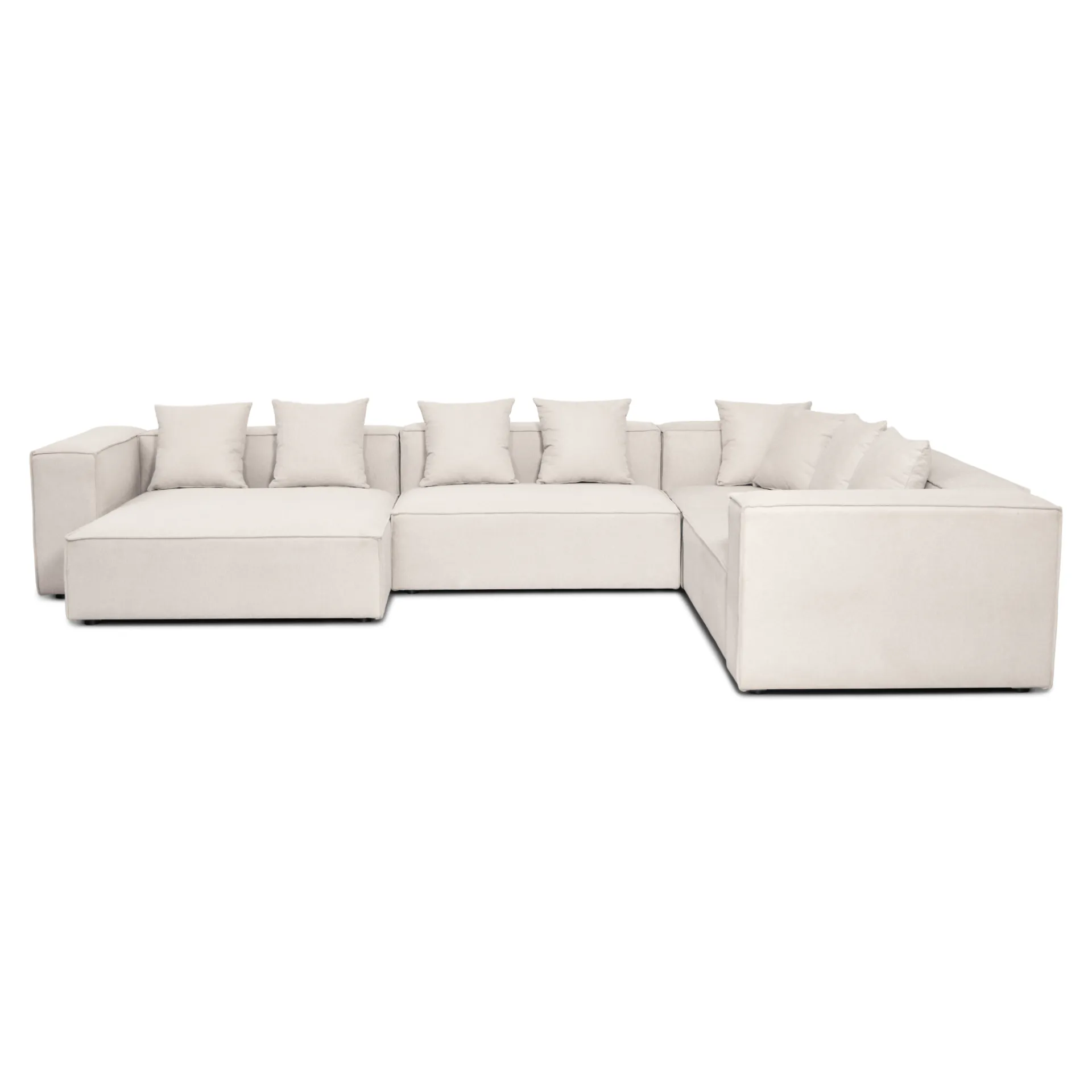 Hailey beige u-sofa modulsofa er en sand fryd for øjet og indbyder til afslapning. Den lave og dybe konstruktion gør den perfekt til afslappede stunder. Denne modulsofa, som er en del af vores familie af fleksible modulsofaer, tilbyder en overflod af kombinationsmuligheder. Den består af 4 moduler: et modul med arm, et midtermodul, et hjørnemodul og en chaiselong.