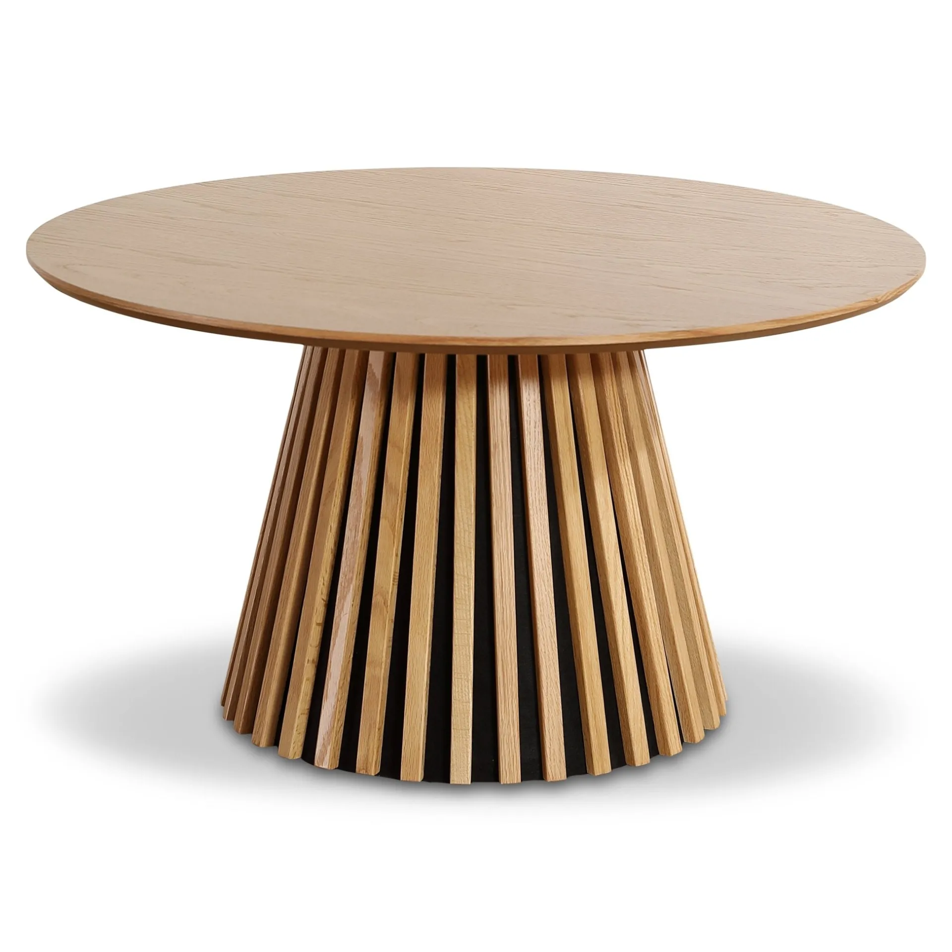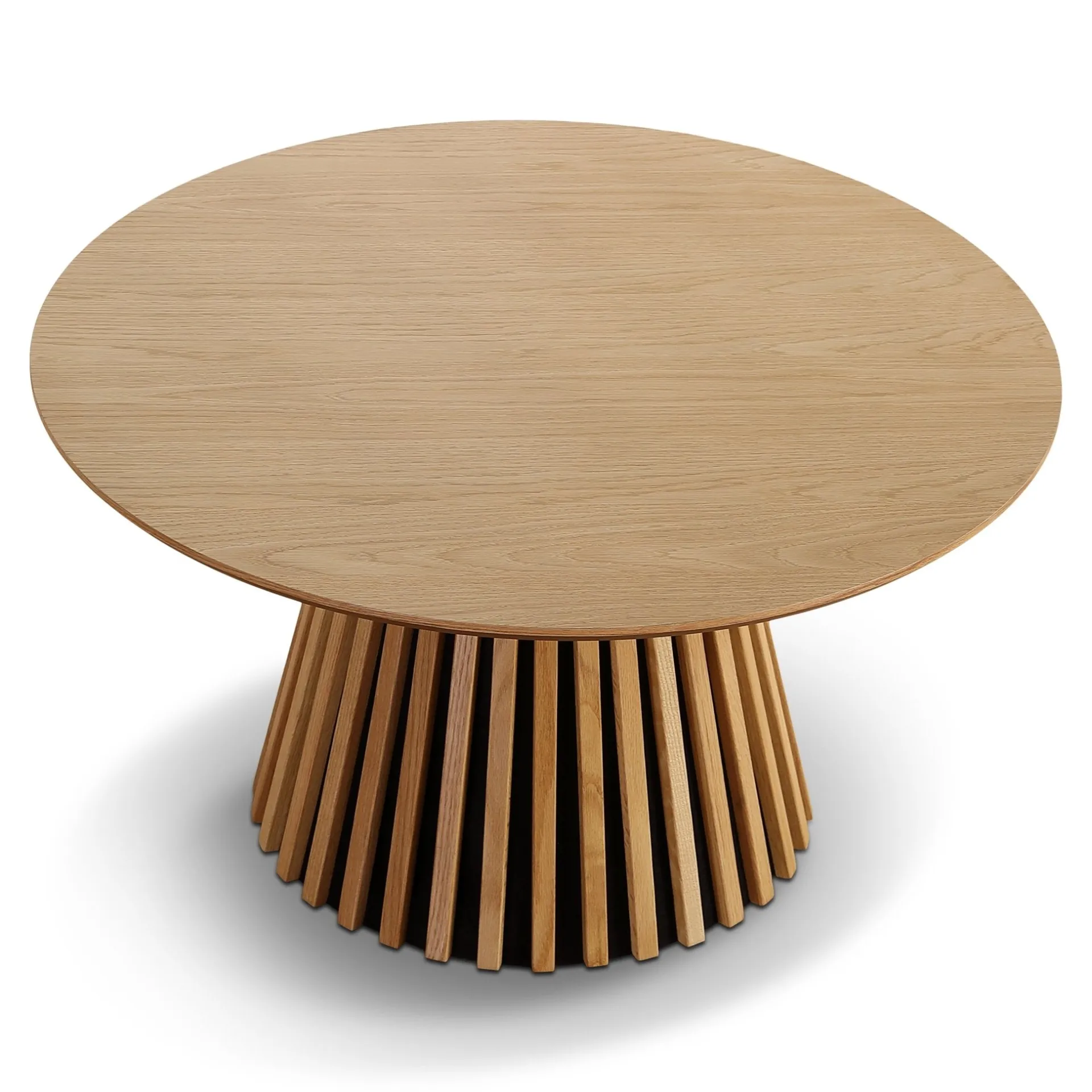 Den runde bordplade i egefiner giver et blødt og indbydende udtryk, mens den karakteristiske lamelfod giver et moderne præg.
