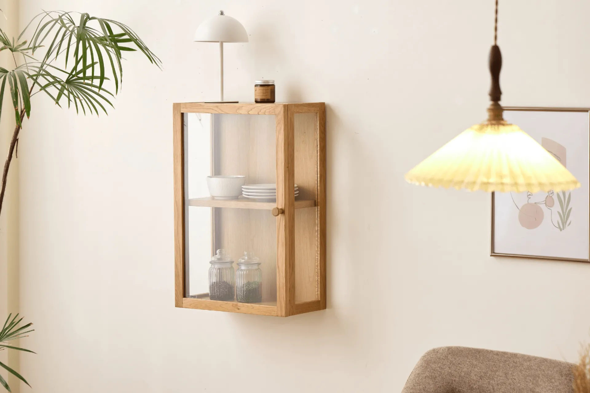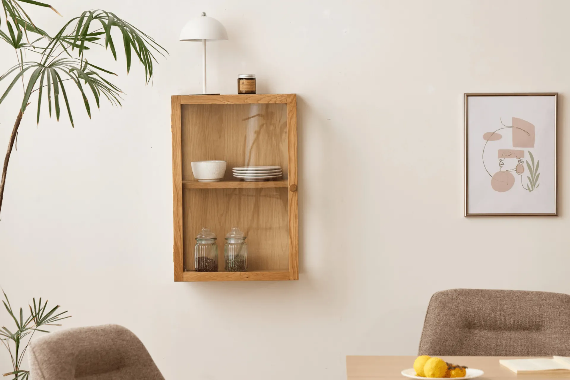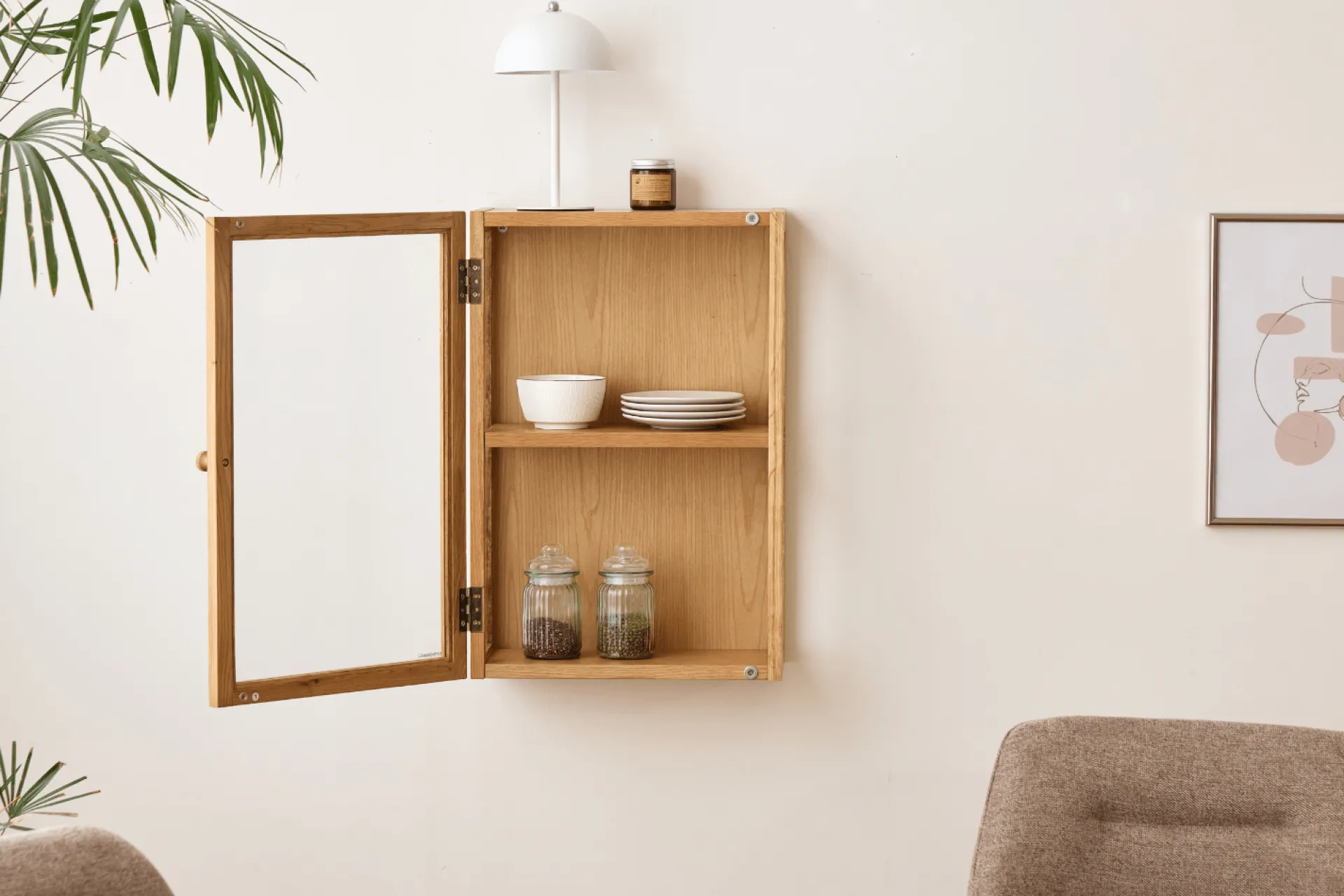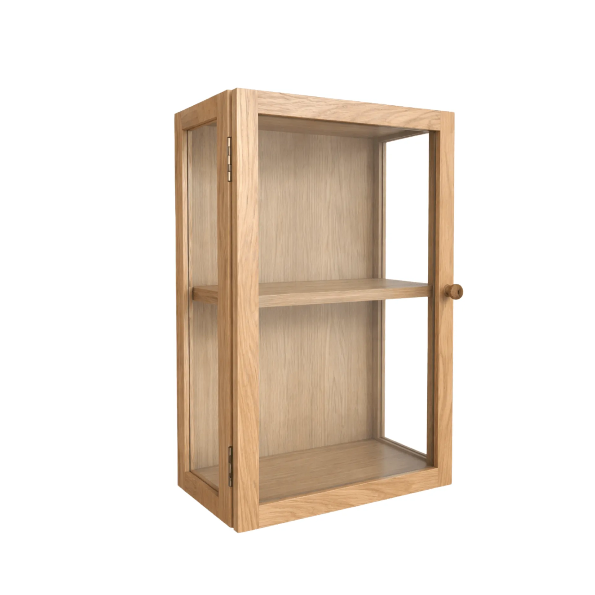 Dette vægskab har et enkelt og roligt udtryk, der passer godt ind i en skandinavisk indretning. Kombinationen af træ og glas giver et let design, som gør skabet velegnet til både moderne og klassiske hjem.