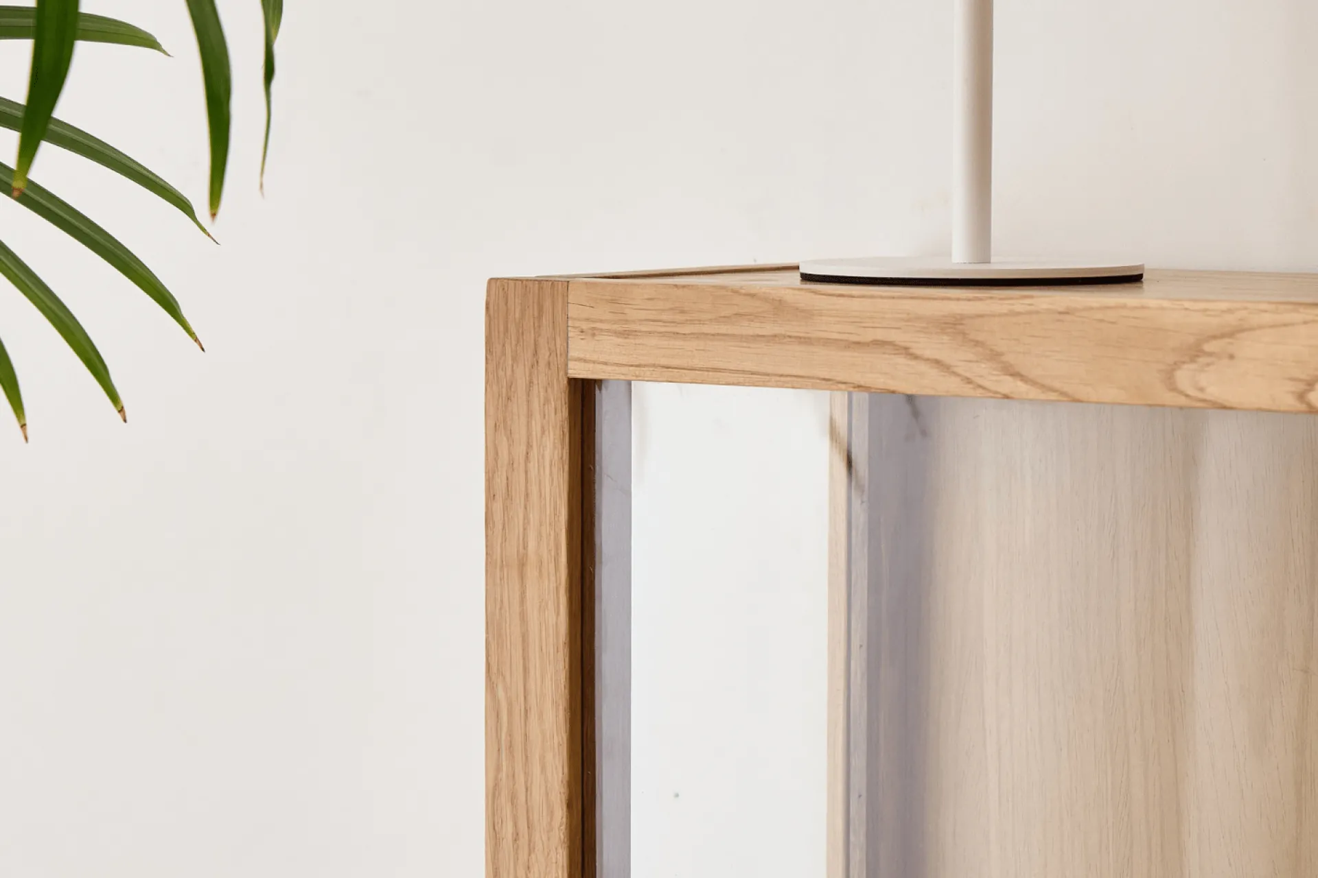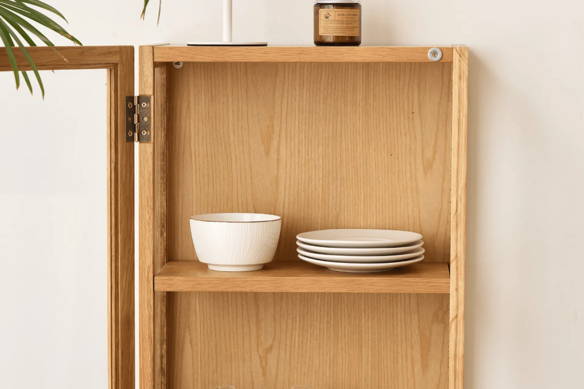 Skabet er en praktisk indretningsløsning, når der er behov for ekstra opbevaring uden at fylde for meget i rummet. Den indvendige hylde giver mulighed for at opdele pladsen og skabe overblik, så både dekorative genstande og hverdagsting kan opbevares på en overskuelig måde.