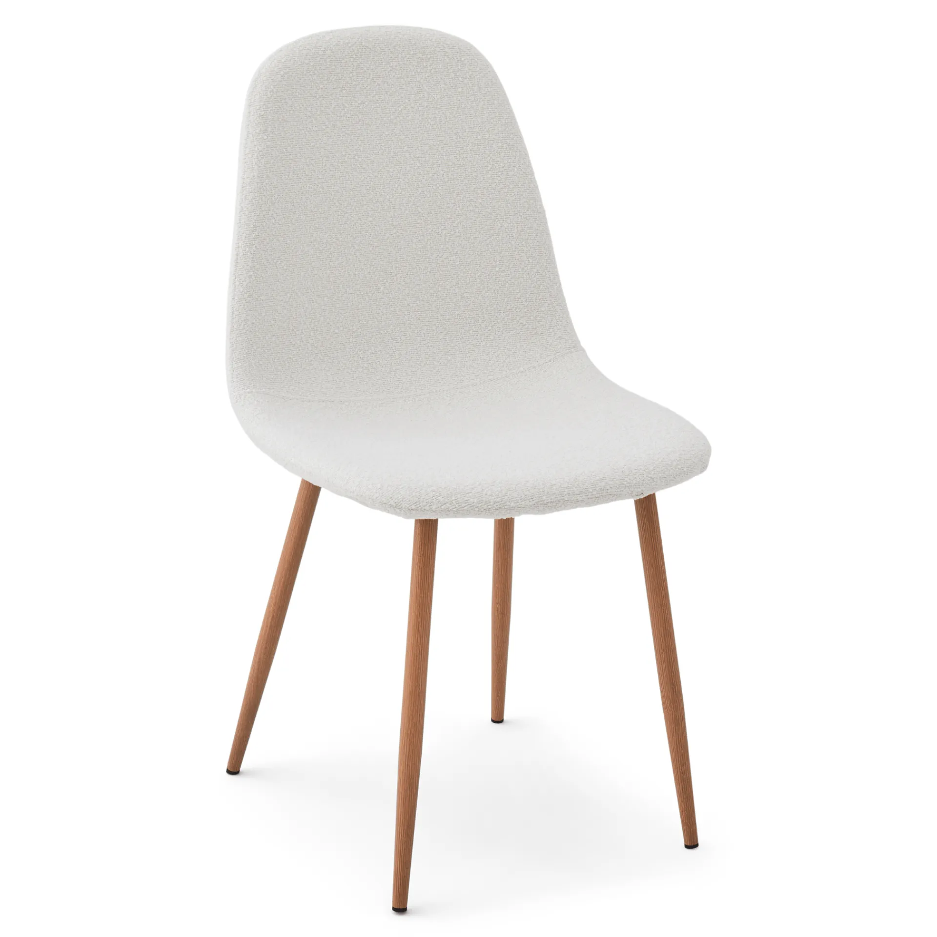 Stolen har ben i røget egelook, som giver både stabilitet og holdbarhed, mens det hvide bouclé-betræk på sædet tilfører et blødt, lyst og tidløst udtryk.