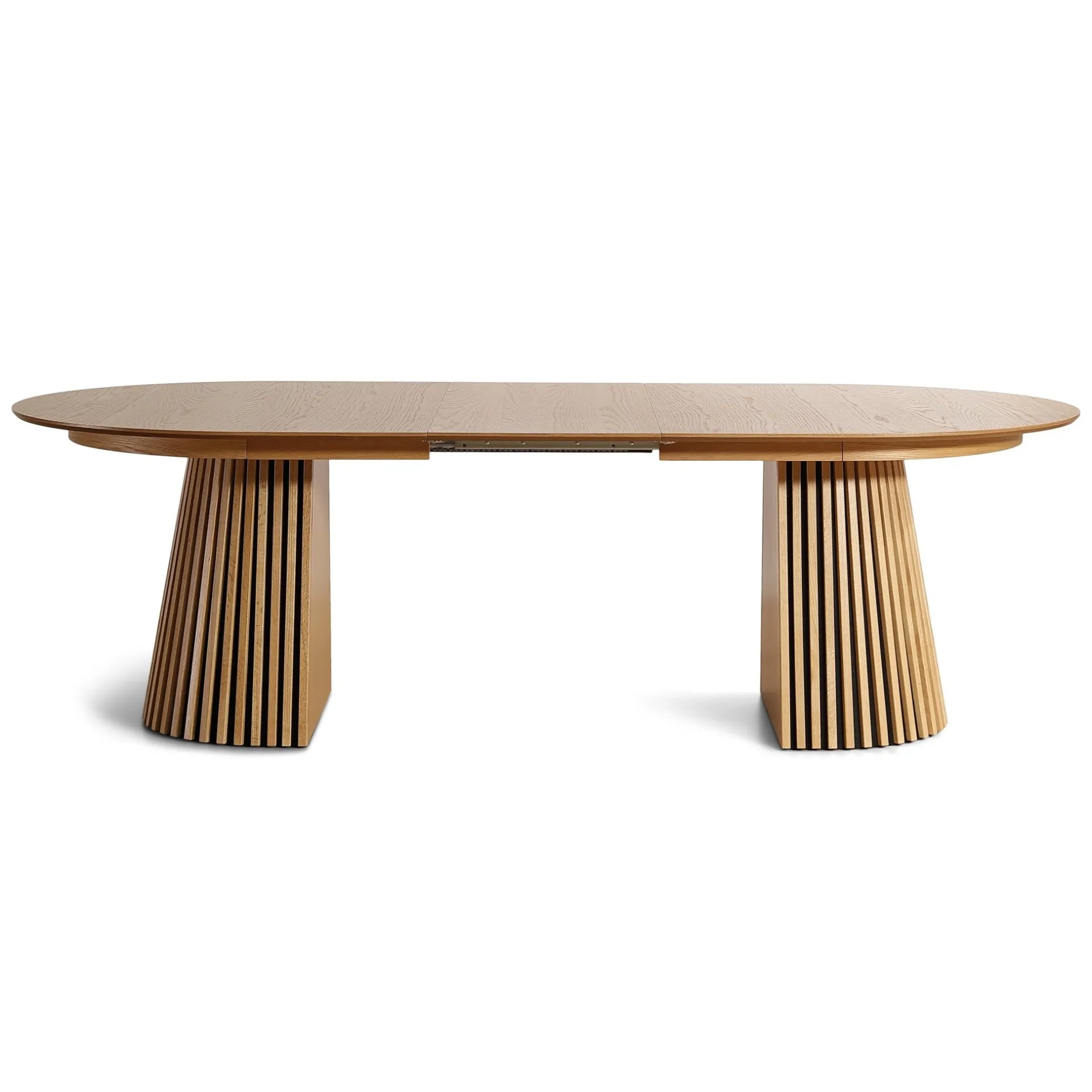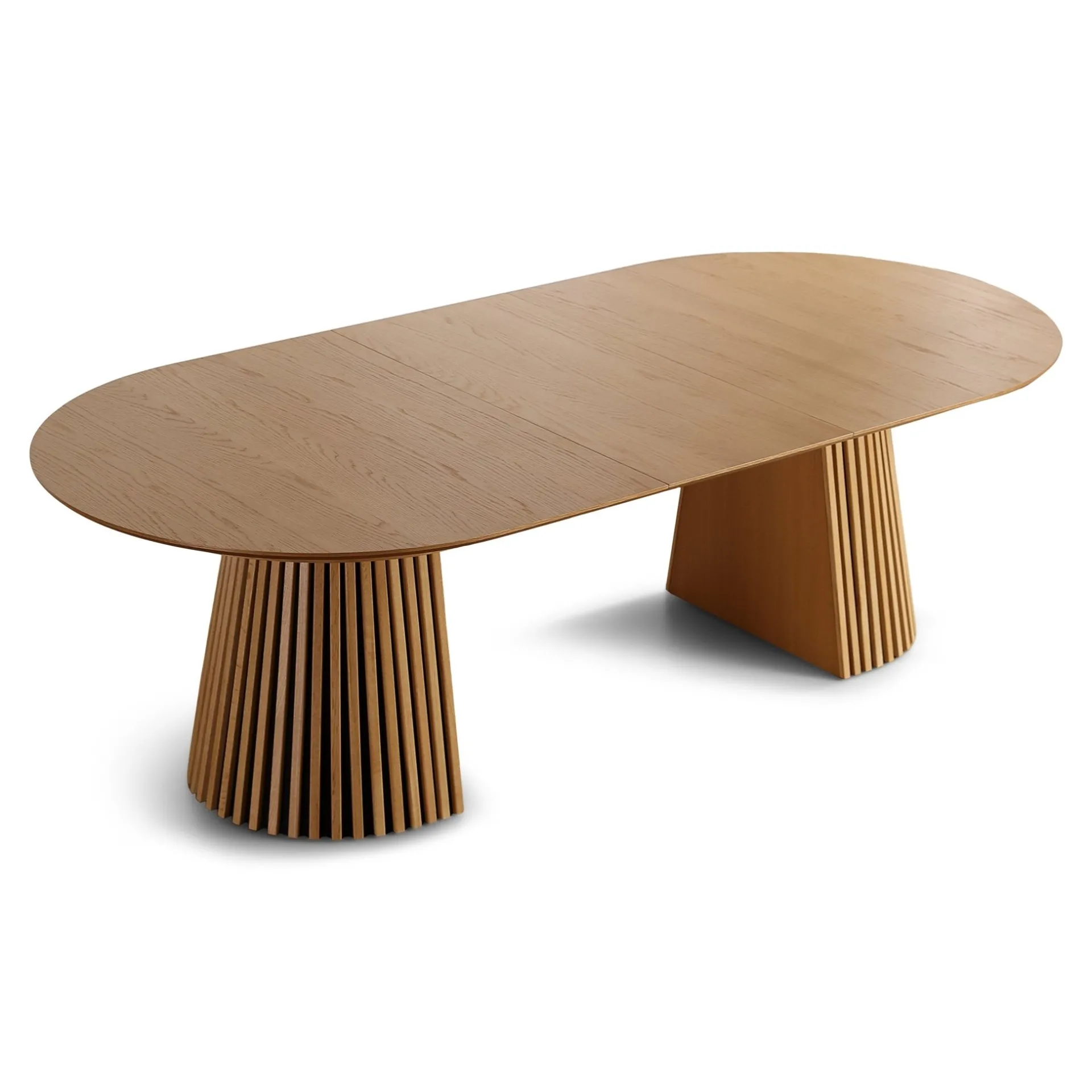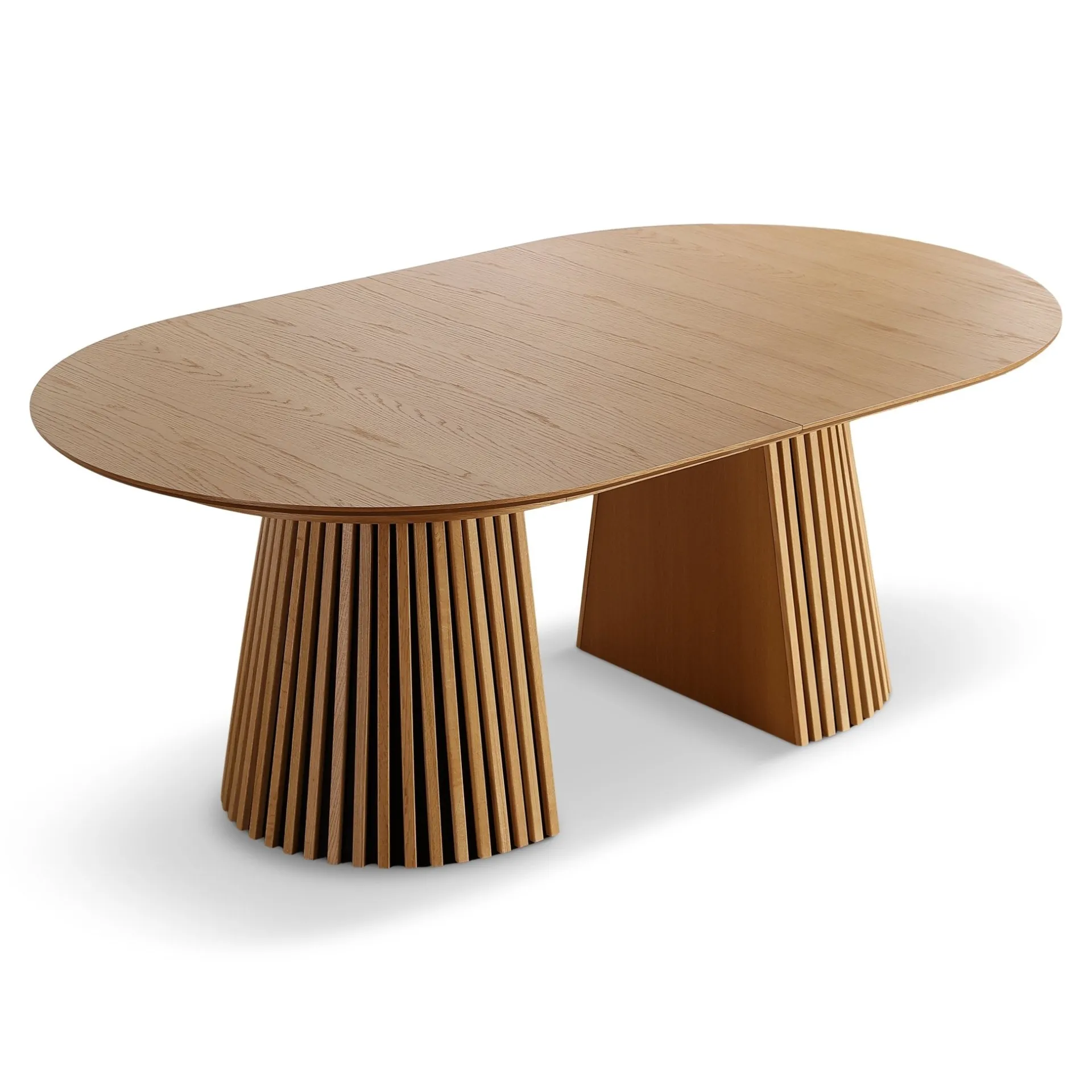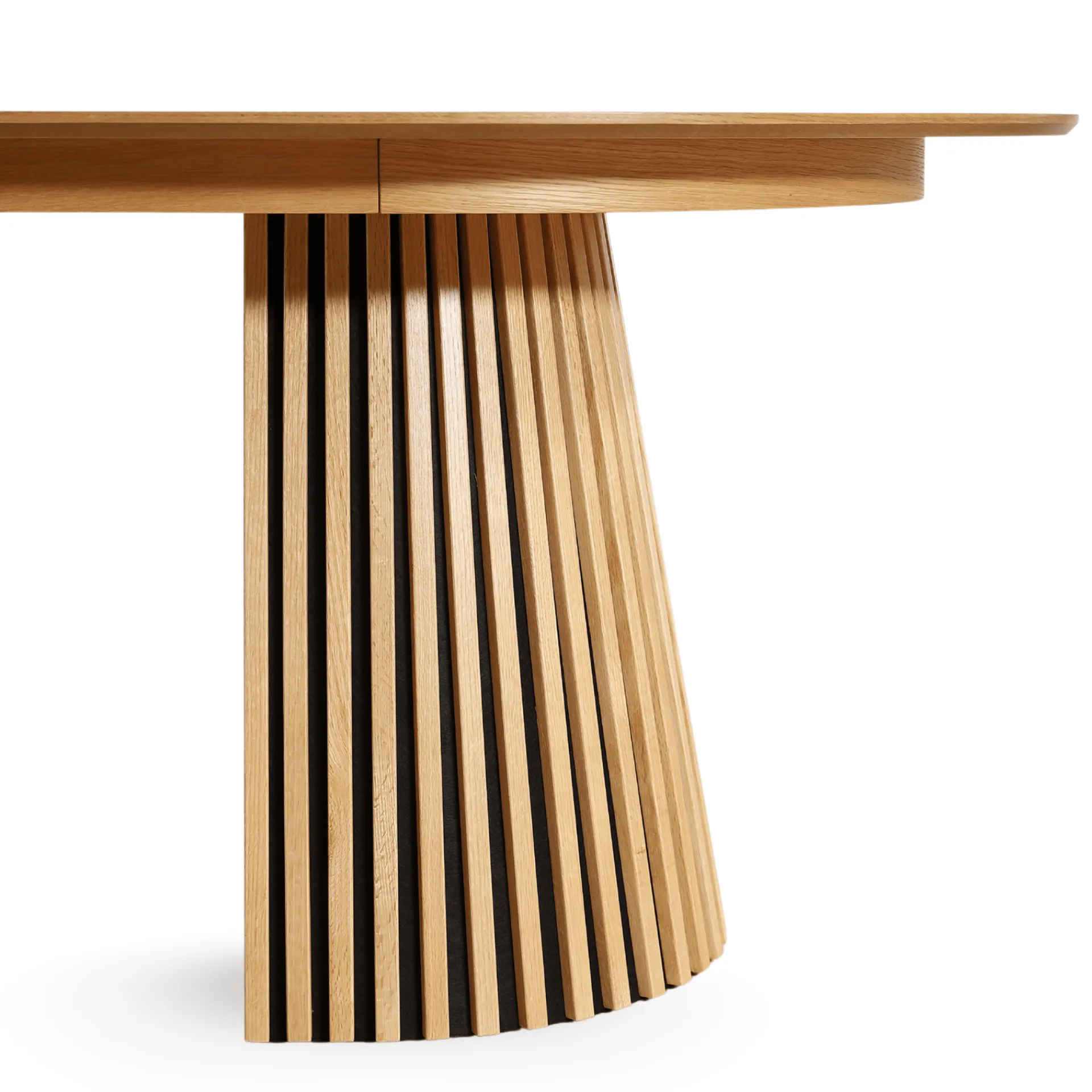 Det her bord rammer en perfekt balance mellem stil og funktion. Den ovale bordplade i egefiner giver et blødt og indbydende udtryk, mens de markante lamelfødder sætter et moderne og karakterfuldt præg på rummet.