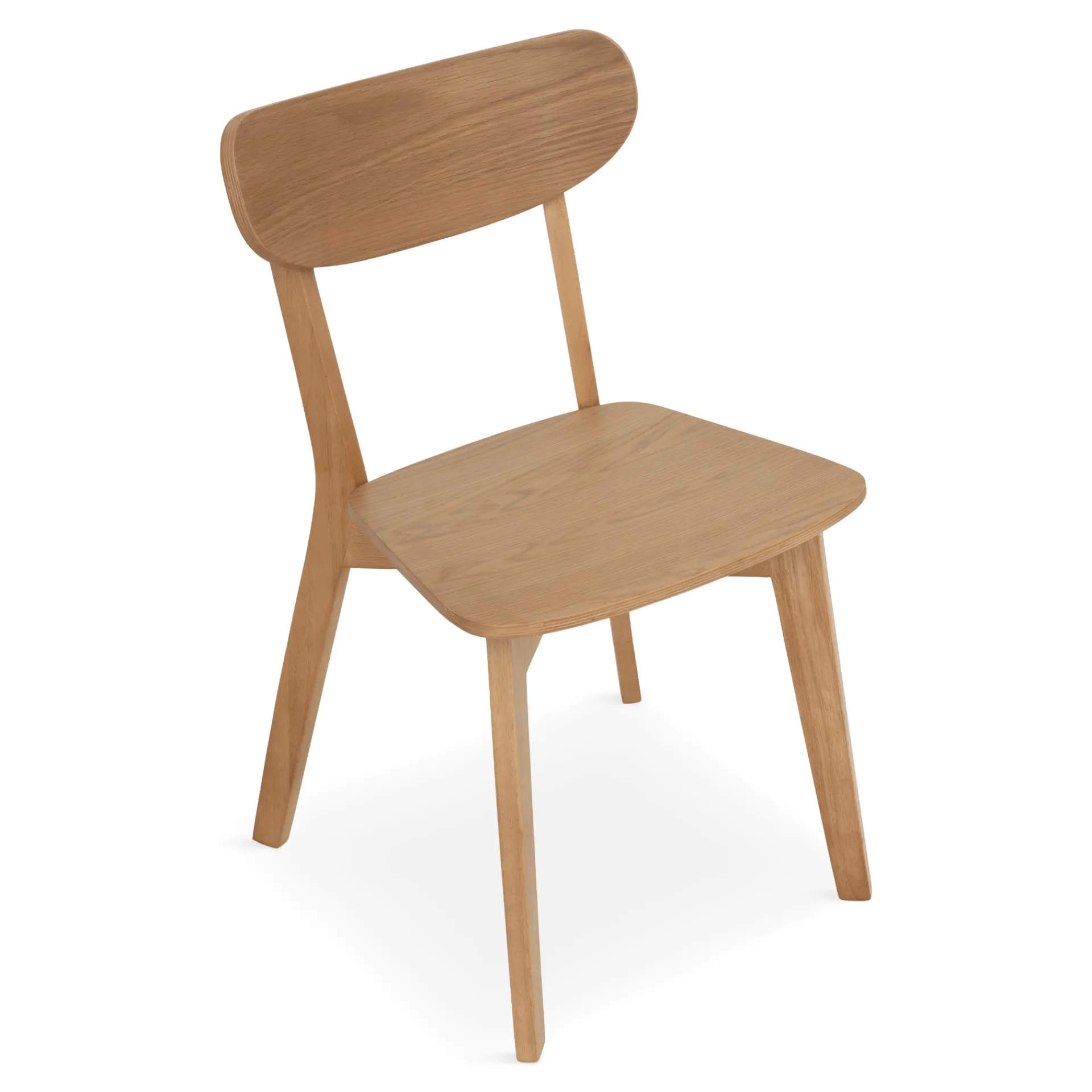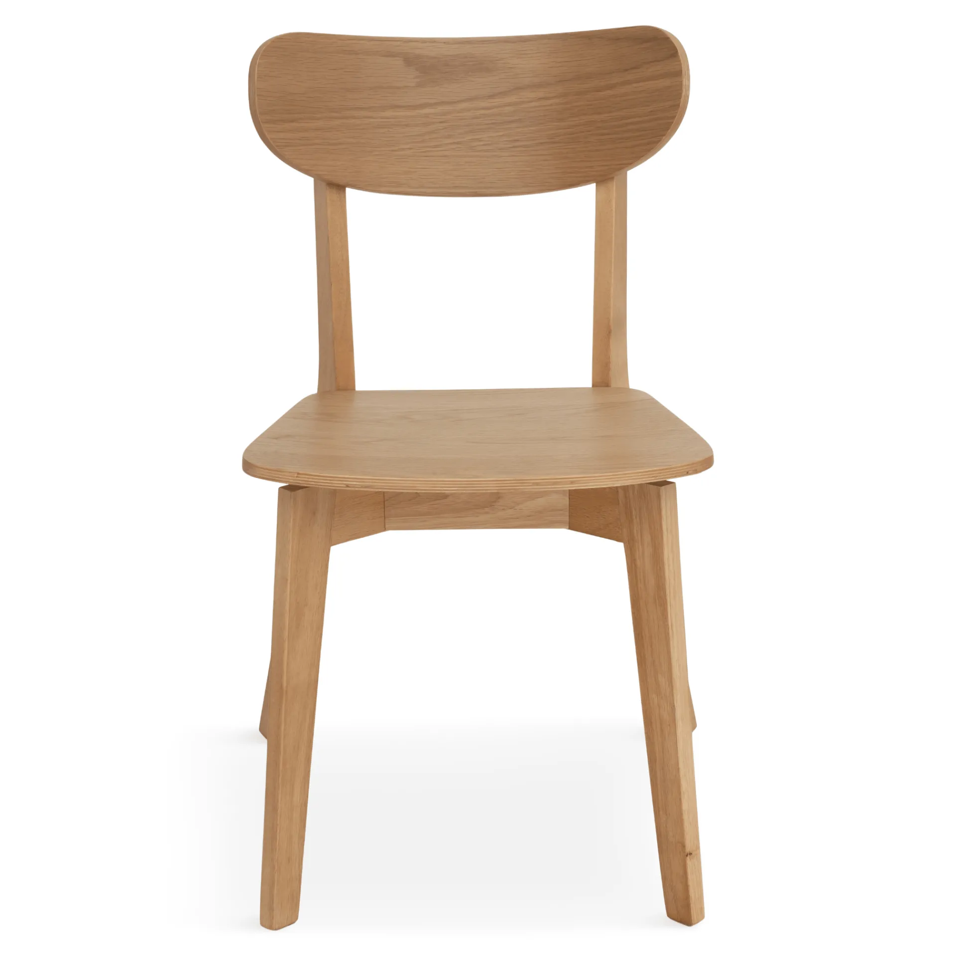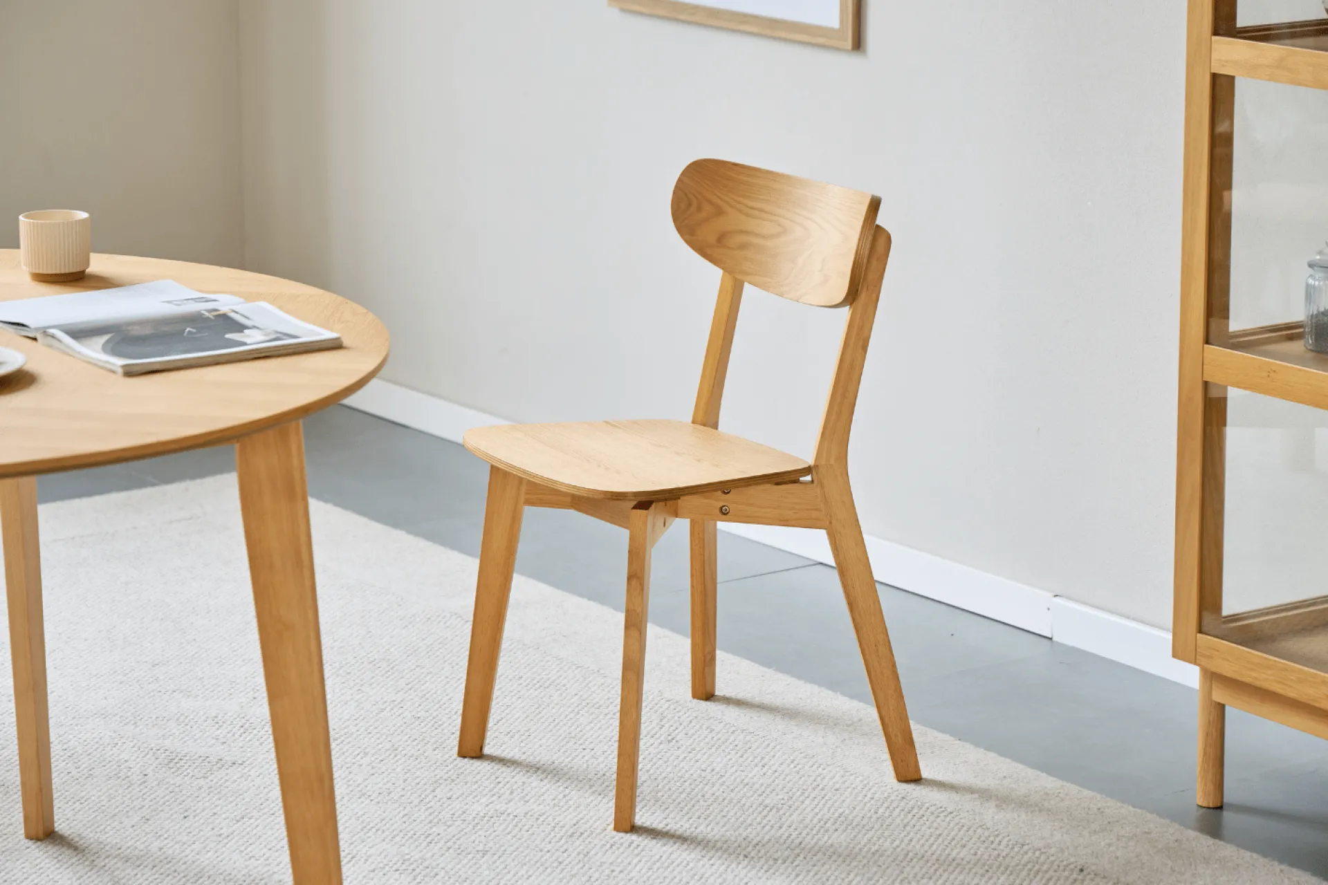 Enkel og tidløs spisebordsstol med let buet ryglæn, der giver ekstra støtte. Stolen er lavet i egefiner og har et klassisk trælook, der passer ind i både moderne og mere traditionelle hjem.