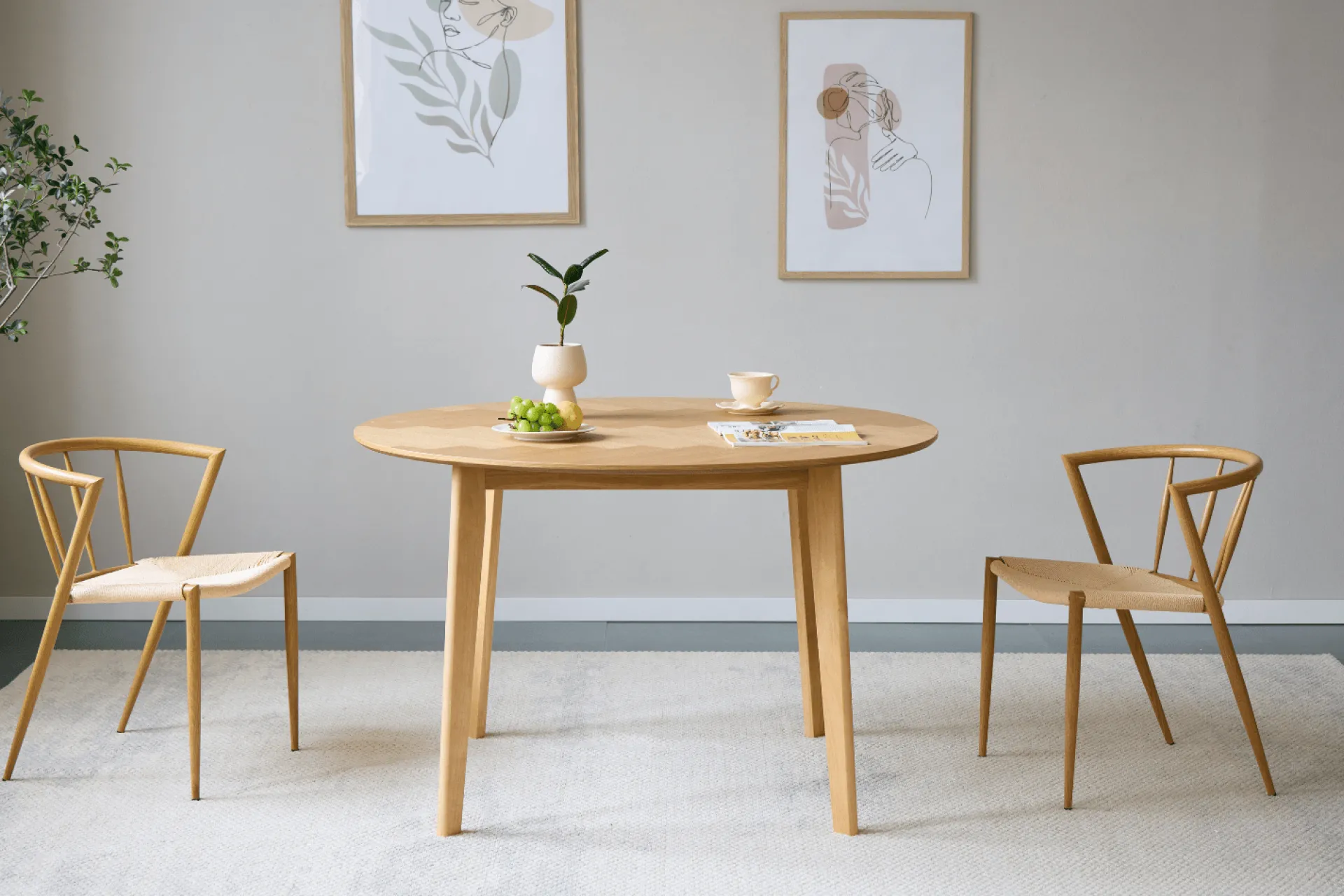Et elegant og tidløst rundt spisebord med flot sildebensmønster, der giver bordpladen karakter og et eksklusivt udtryk. Med en diameter på 120 cm er der god plads til hyggelige måltider og nærvær med familie og venner.