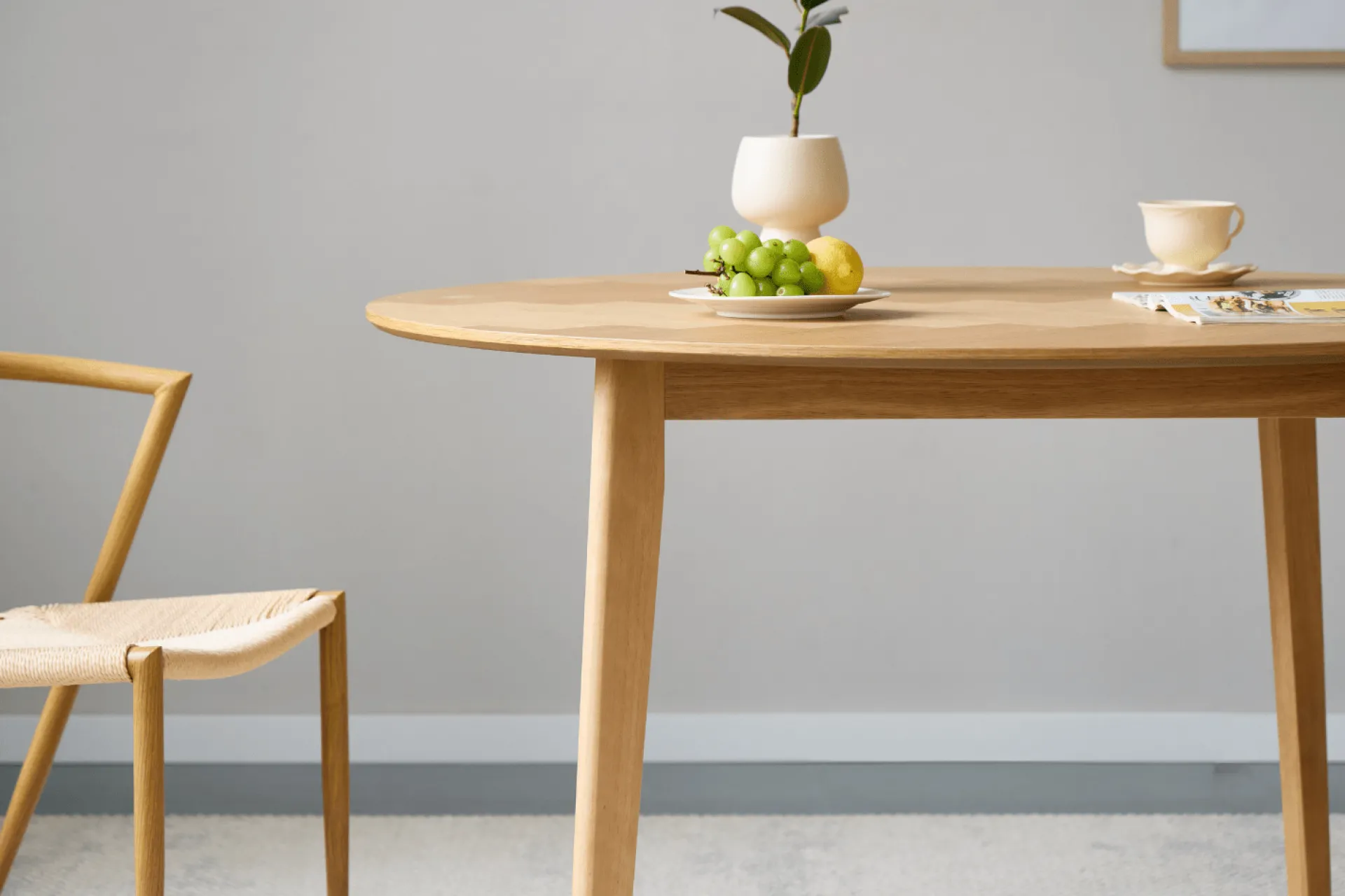 Det runde design skaber en naturlig samlingsplads i hjemmet, og bordet fås i to flotte varianter – røget egefiner og lys egefiner – så du kan vælge den tone, der passer bedst ind i din indretning.