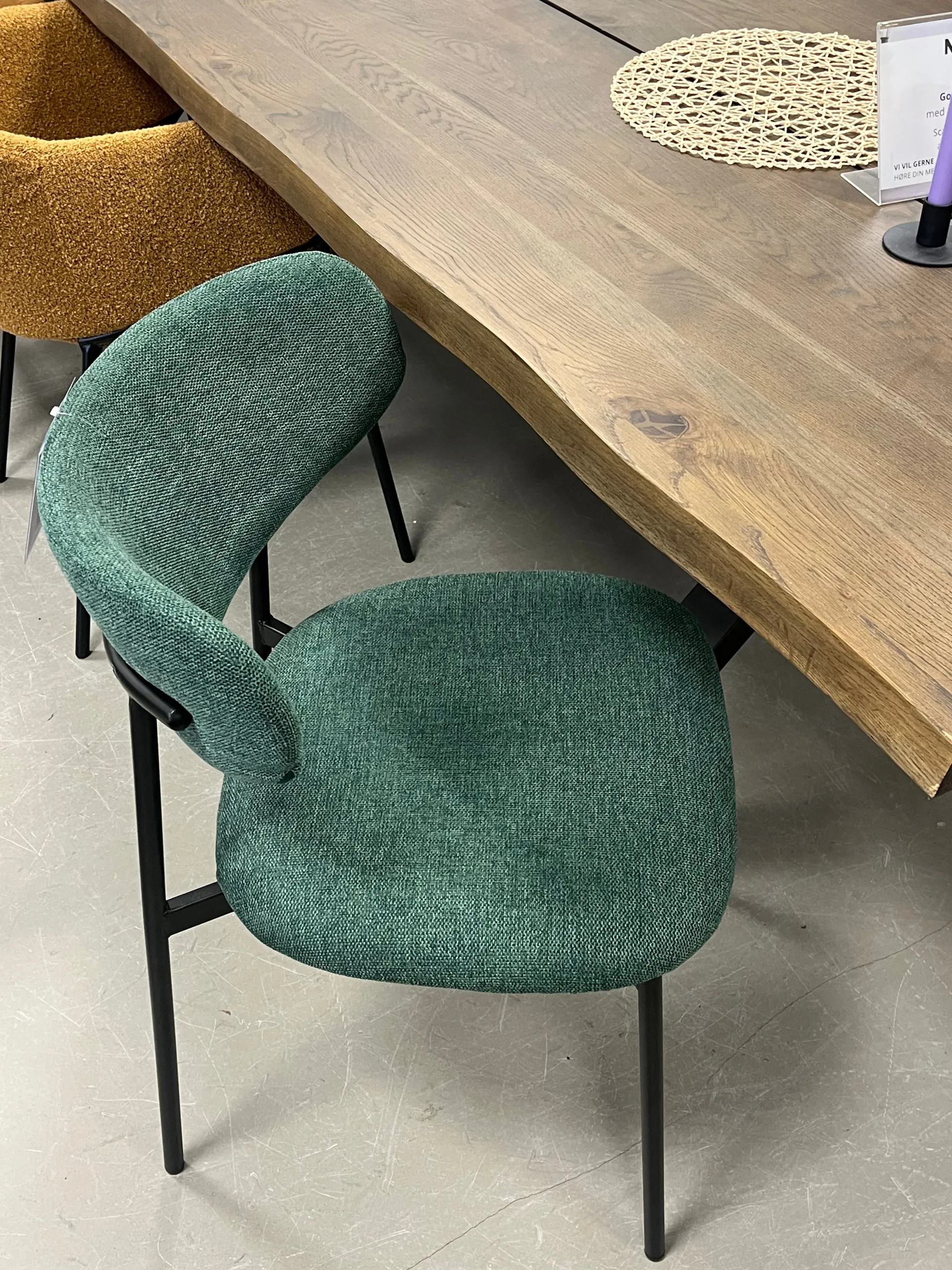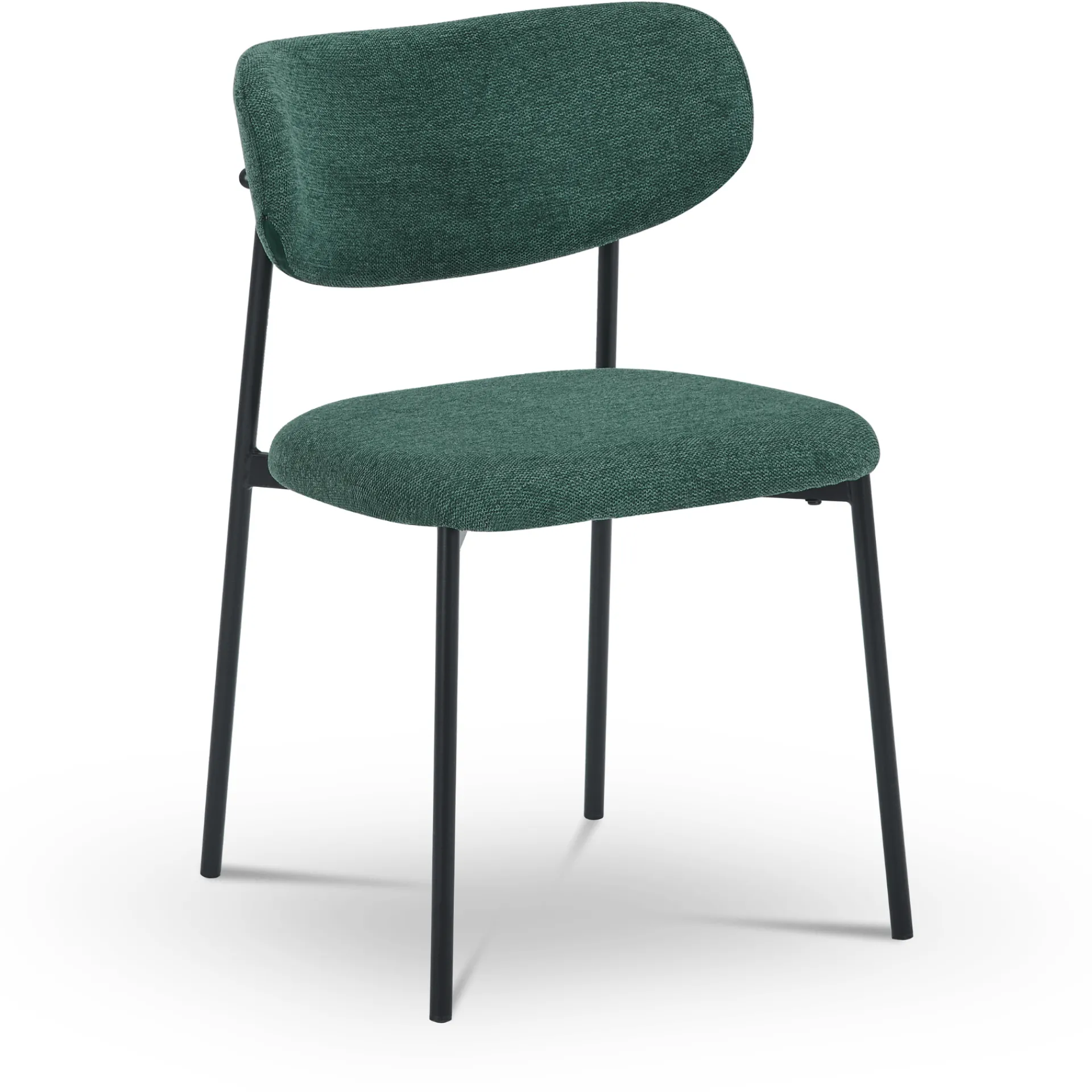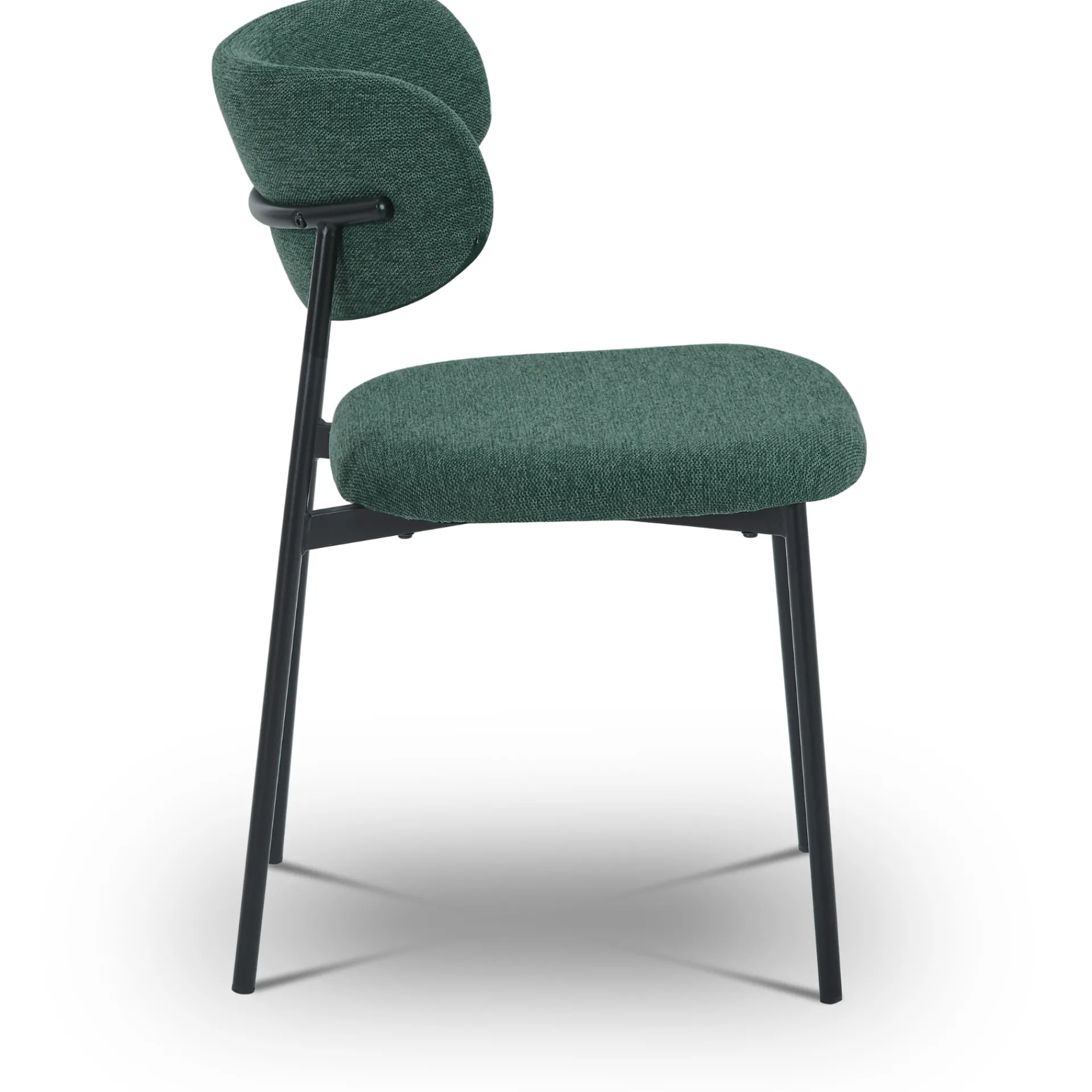 Lucinda spisebordsstolen kombinerer moderne design med komfort. Den er polstret i et blødt, grønt tekstil og har en elegant, rundet ryg, der giver god støtte. De sorte metalben skaber en smuk kontrast til det bløde stof, hvilket giver stolen et stilfuldt og tidløst udtryk. Denne stol er ideel til både spisebordet og som ekstra siddeplads i hjemmet og vil tilføre et strejf af elegance til ethvert rum.