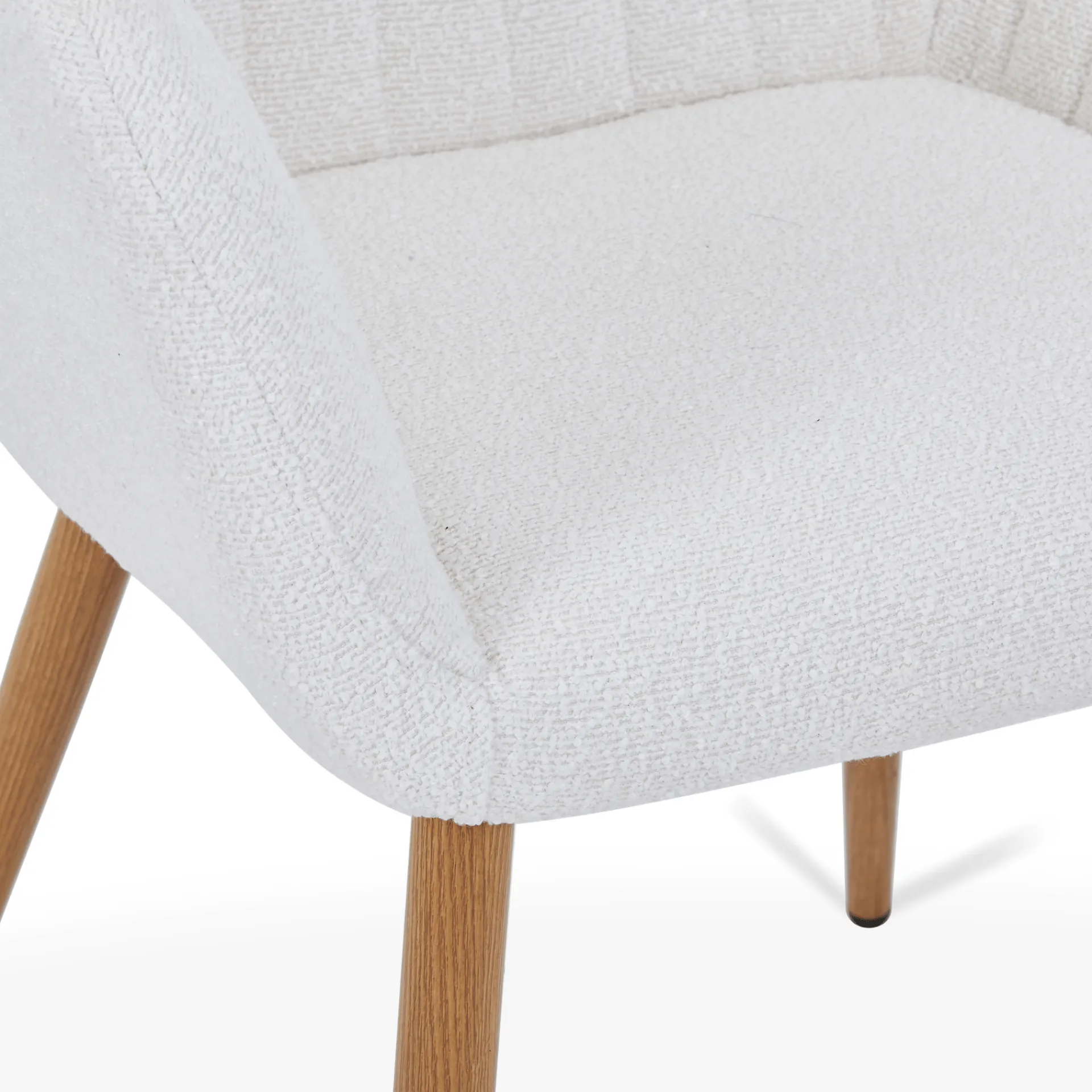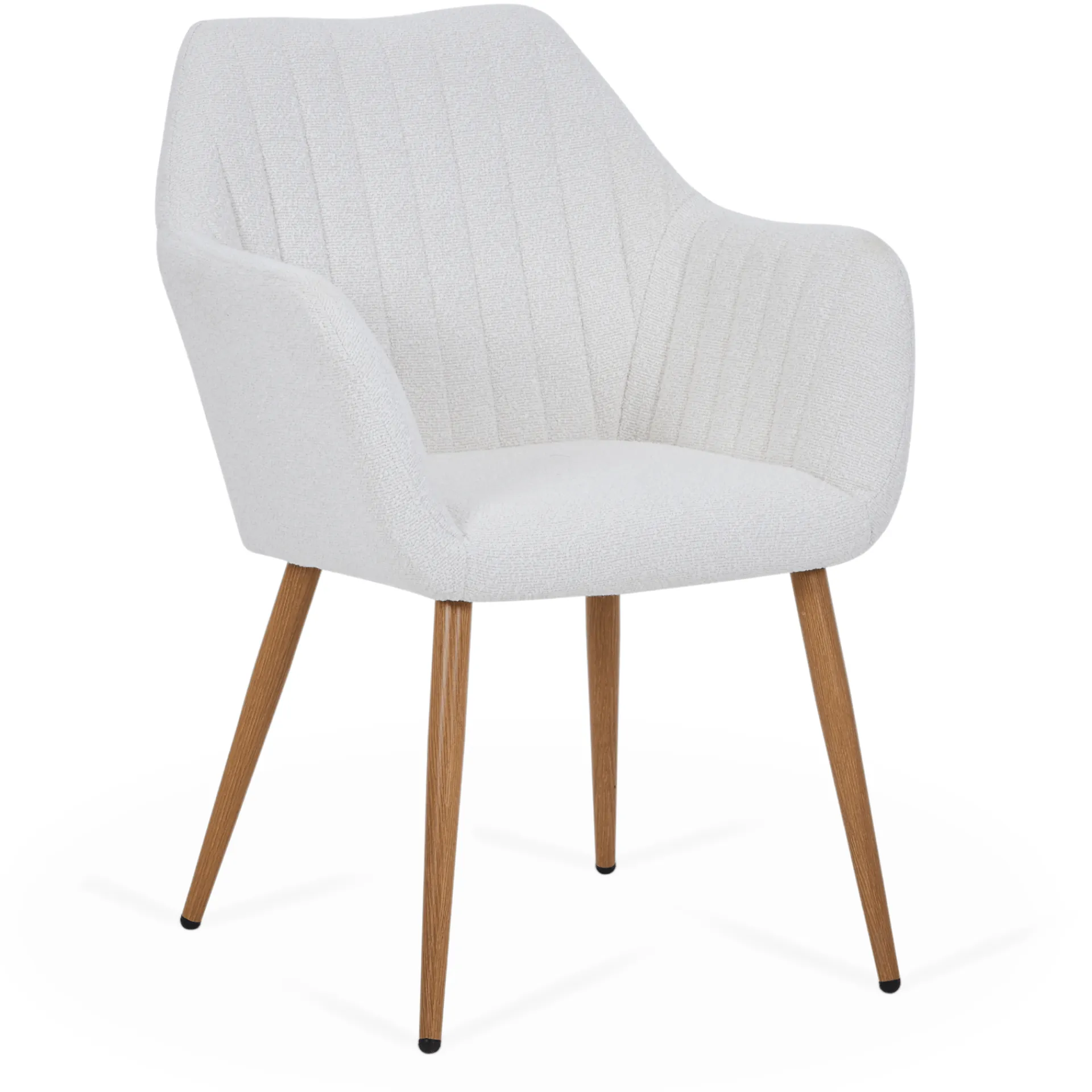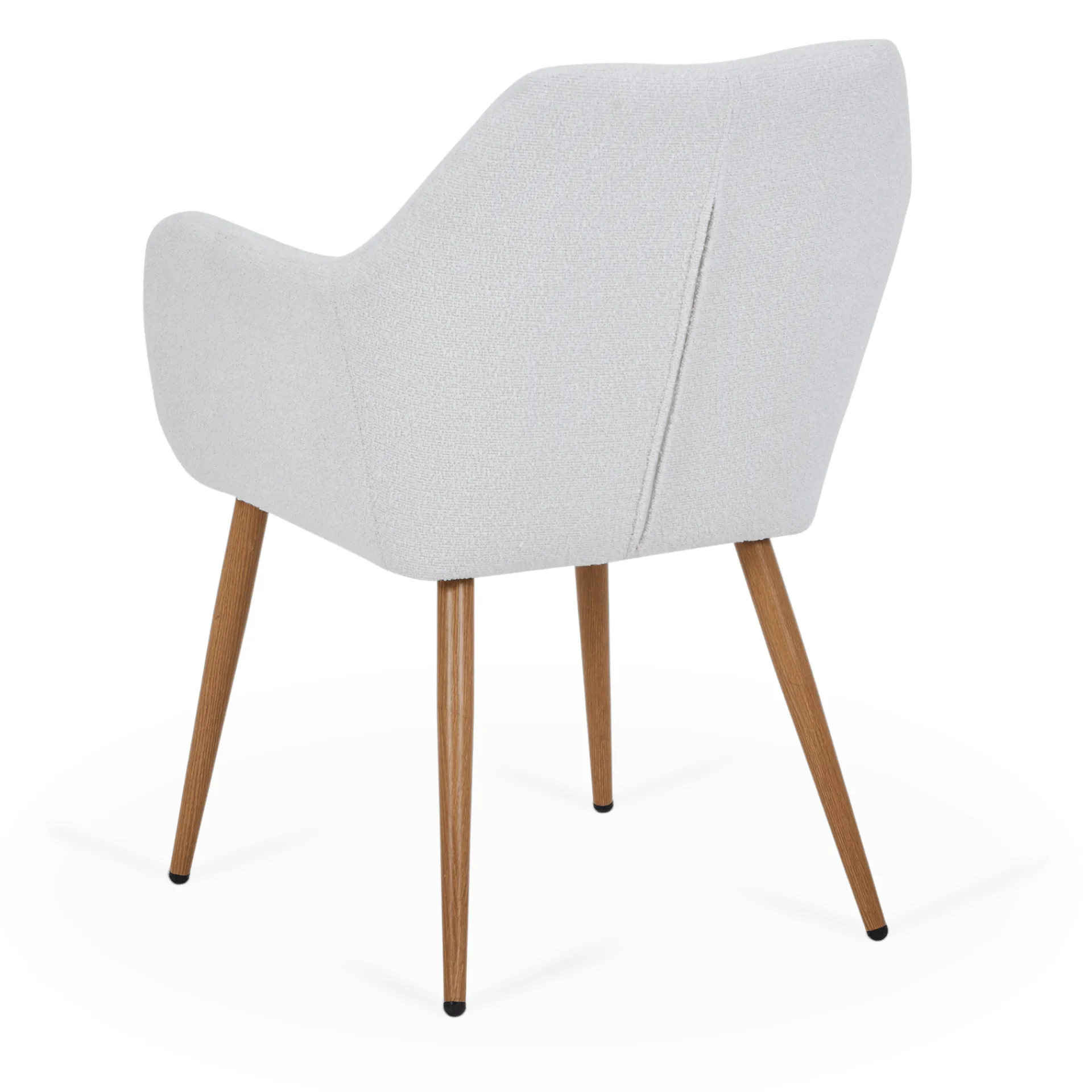 Vanessa spisebordsstol i hvidt boucle med armlæn er en smuk og komfortabel stol, der vil bringe liv og farve til ethvert spisebord eller kontor. Dens bløde hvide boucle føles lækkert mod huden, mens armlænene giver ekstra støtte og komfort. Stolens robuste stel i egelook og solid base sikrer stolens styrke og holdbarhed. Hvis du leder efter en varm og komfortabel spisebordsstol, er Vanessa spisebordsstol i hvidt boucle med armlæn et fremragende valg.