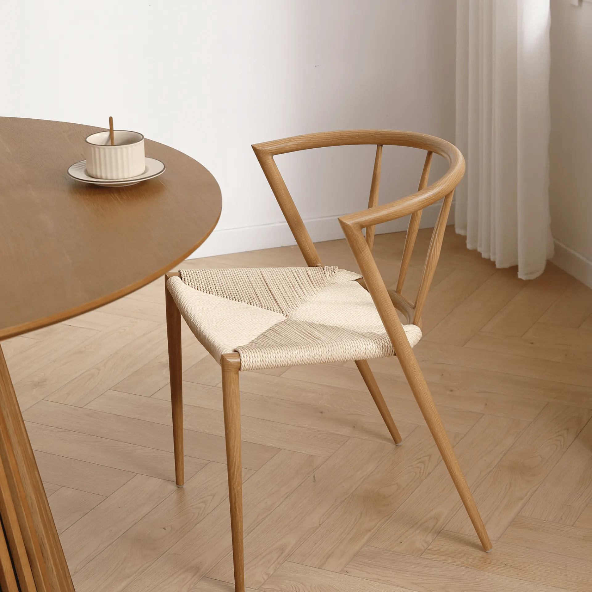 Stolens klassiske design er taget direkte ud fra den skandinaviske stil og ud fra tanken “Keep it simple”. Stolens form er enkel, men med elegante linjer og den lyse flet i sædet er slidstærk og stilren på en og samme tid, samtidig med stolen er stabelbar.