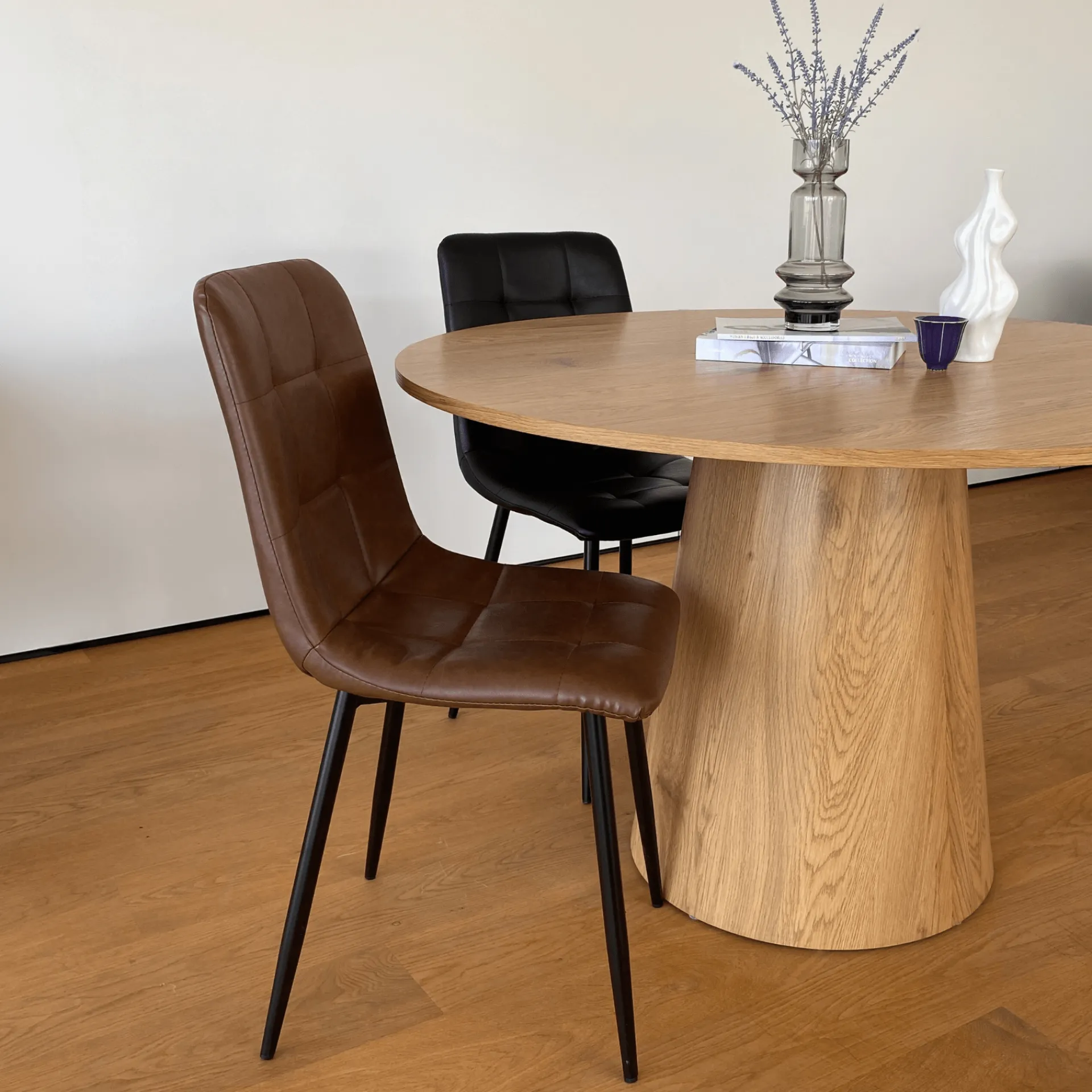 De sorte metalben giver ikke blot stolene en moderne kontrast, men de tilbyder også solid støtte og stabilitet. Metalbenenes minimalistiske design passer perfekt til kunstlæderets luksuriøse udseende og skaber en afbalanceret æstetik, der vil passe ind i enhver indretning.