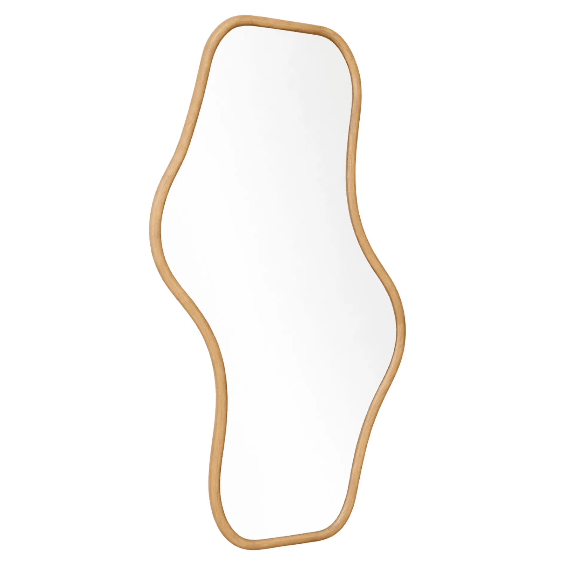 Angela er et dekorativt og moderne spejl med en elegant organisk form, der skaber et let og naturligt udtryk i rummet. Det er designet med en træ ramme, hvilket giver et skandinavisk og rustik look, der passer ind i de fleste hjem.