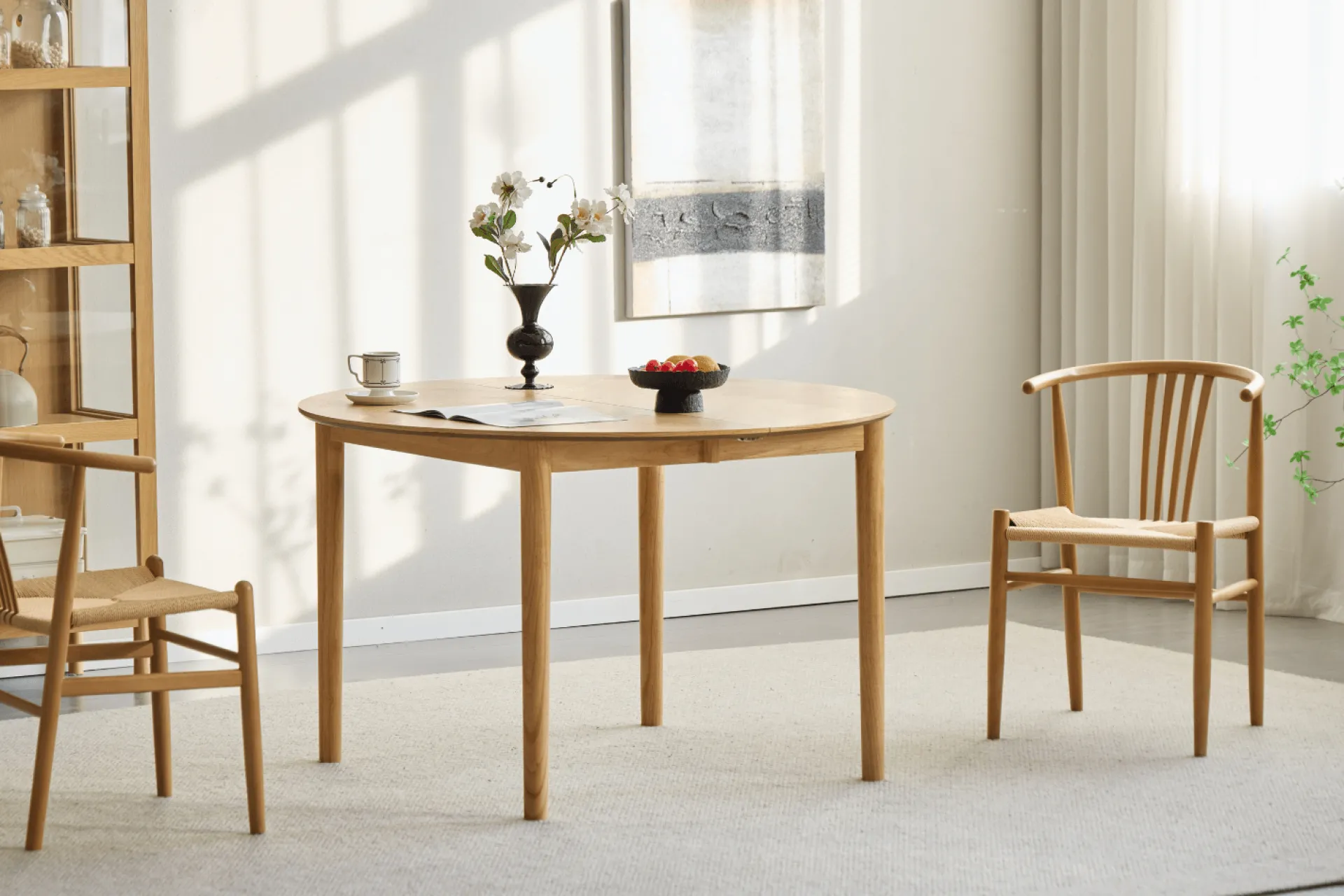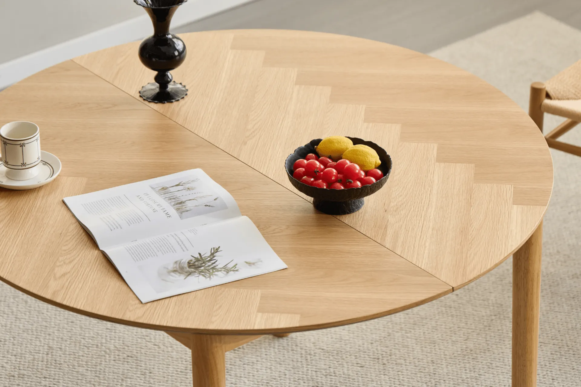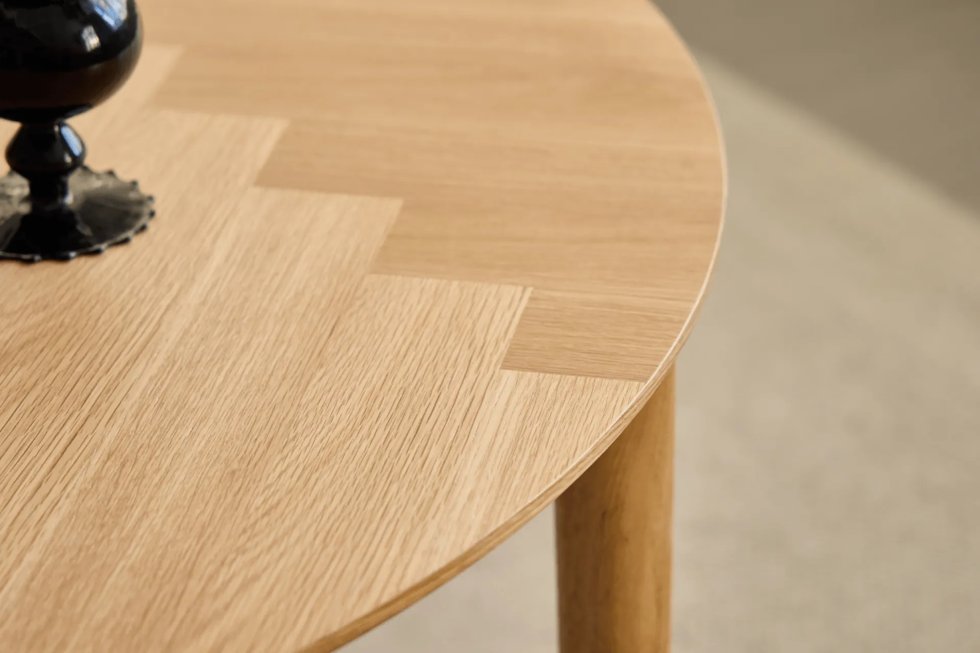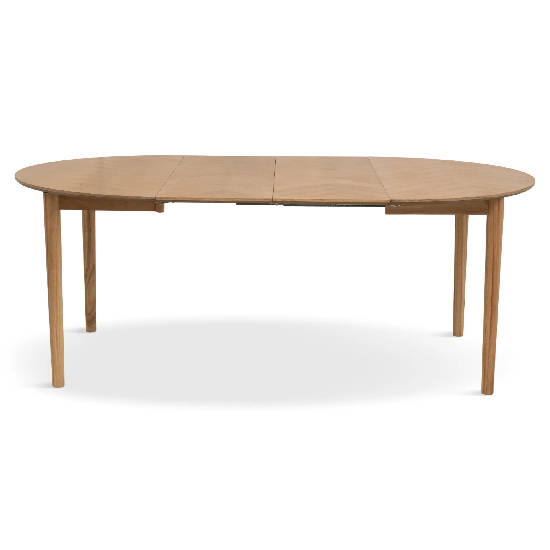 Rundt spisebord med udtræk og sildebensmønster