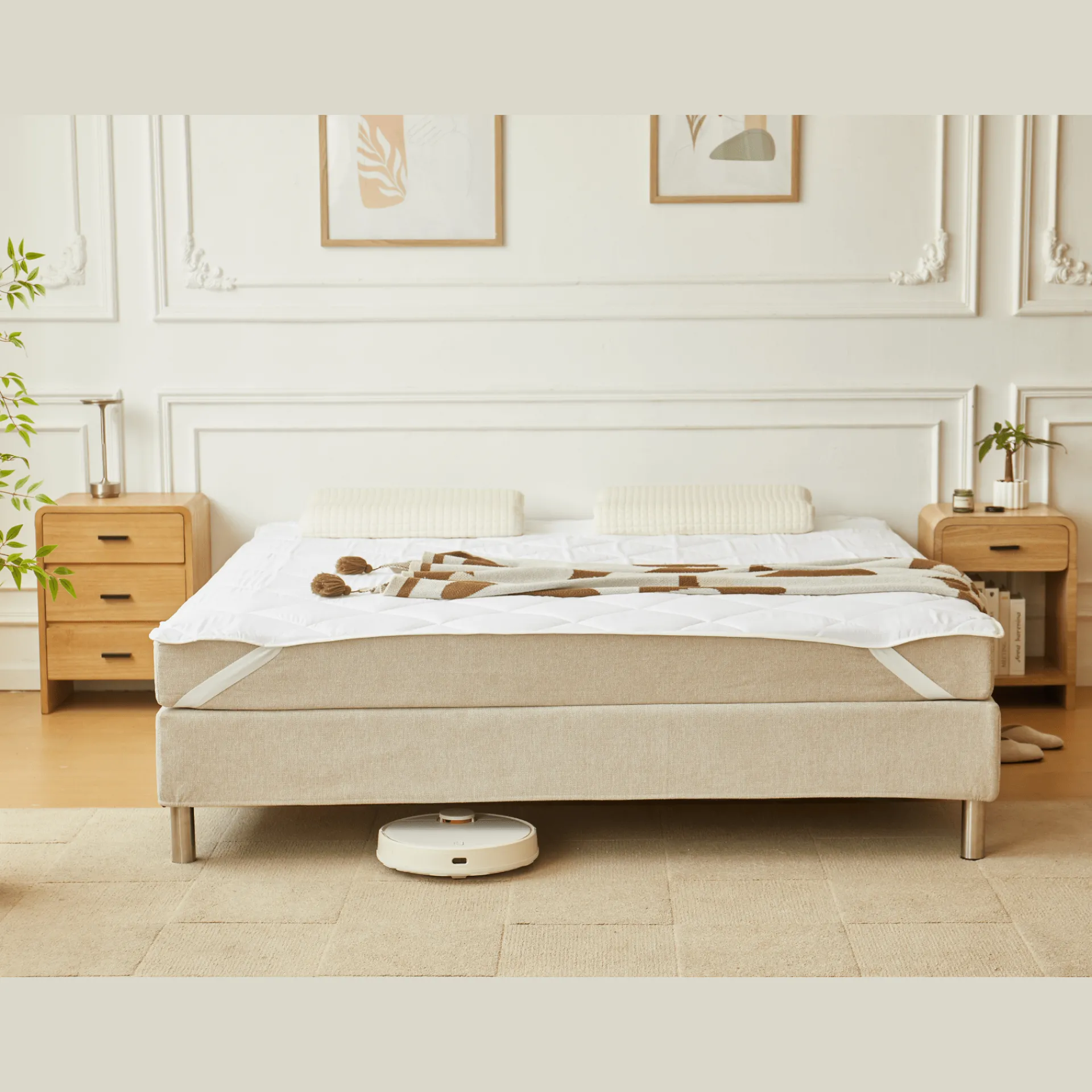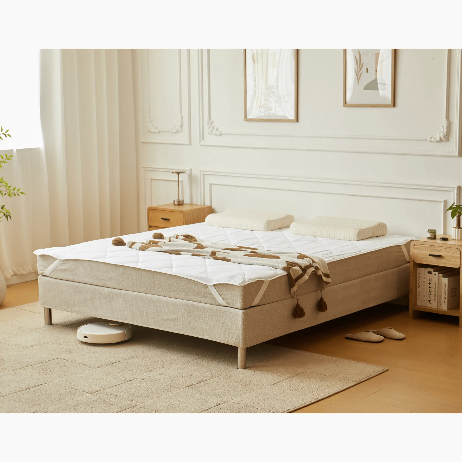 Opgrader din sovekomfort med denne quiltede hvide rullemadras, det ideelle valg til at beskytte din madras og give et ekstra lag blødhed.