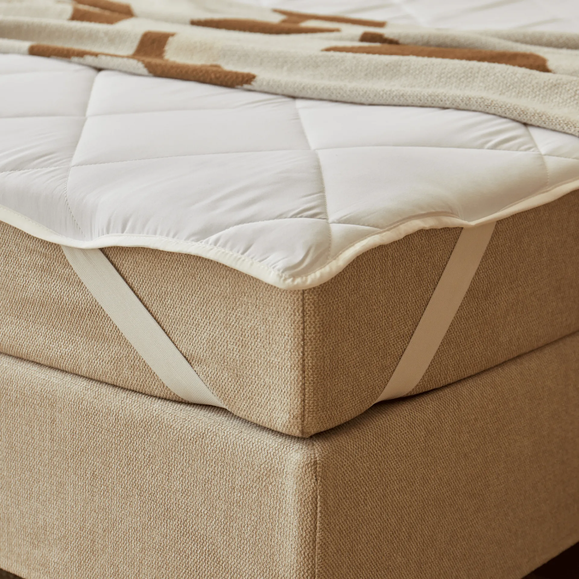 | Materiale | • Polyesterfiberfyld (quiltet for jævn fordeling og formstabilitet) • Elastikstropper i hjørnerne (sikrer korrekt placering) |