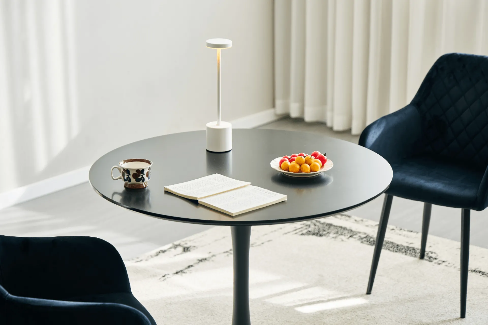 Dette elegante spisebord er det perfekte valg til mindre spisestuer og hjem, der ønsker at tilføje et strejf af luksus og stil. Bordet har en rund bordplade med et blankt hvidt finish.