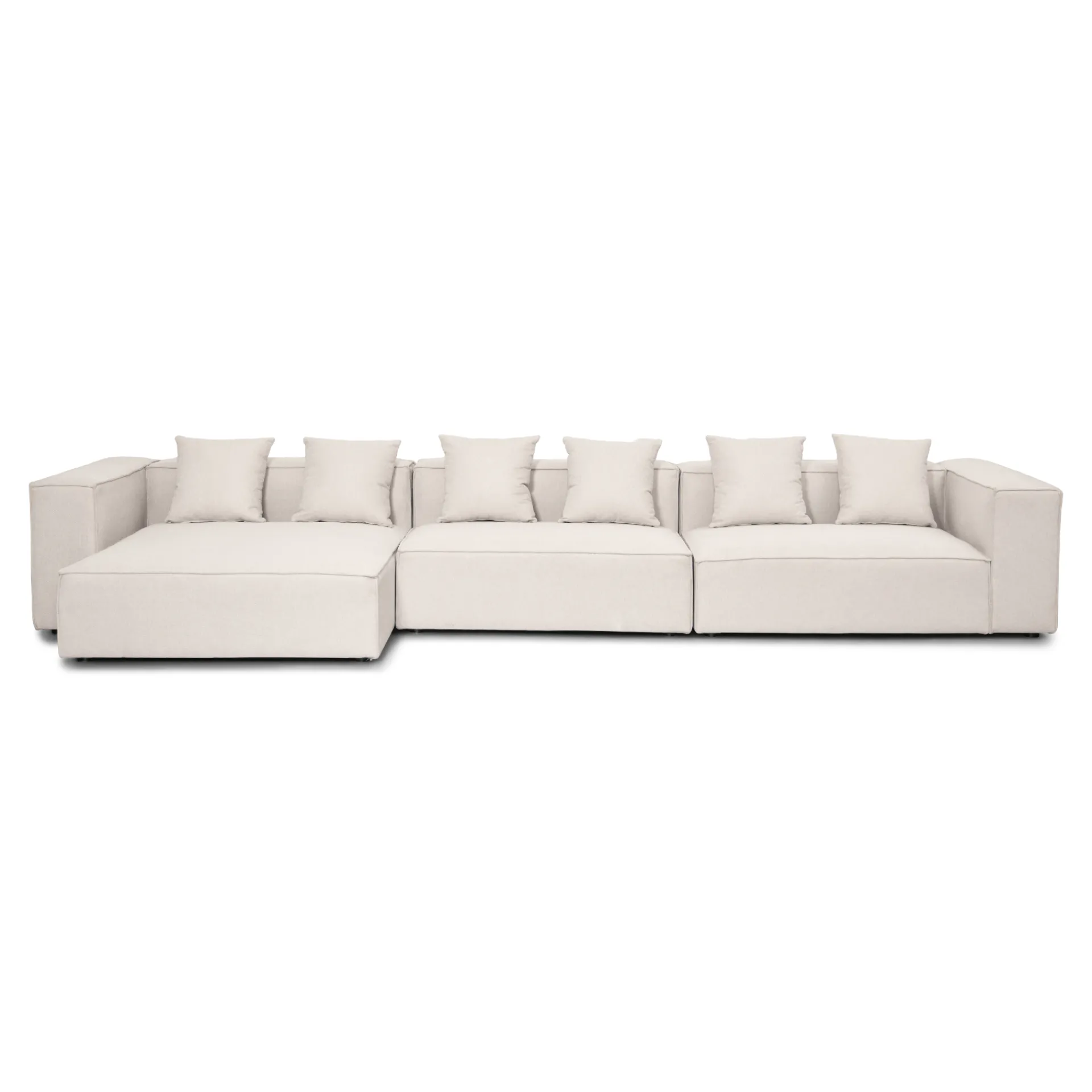Hailey beige venstrevendt chaiselong modulsofa er en sand fryd for øjet og indbyder til afslapning. Den lave og dybe konstruktion gør den perfekt til afslappede stunder. Denne modulsofa, som er en del af vores familie af fleksible modulsofaer, tilbyder en overflod af kombinationsmuligheder. Den består af tre moduler: et modul med arm, et midtermodul, og en chaiselong.