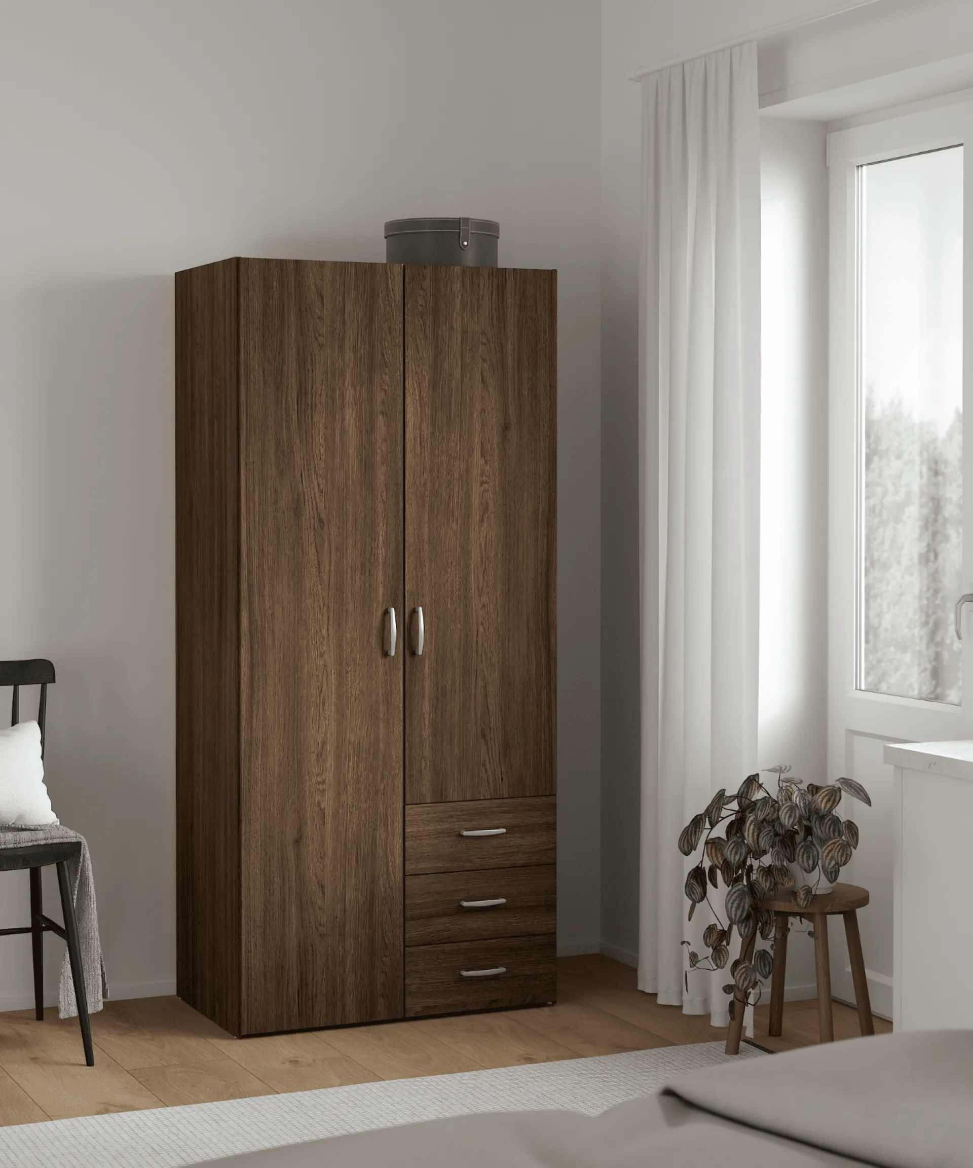 Malia er et stilrent og funktionelt skab, der passer perfekt til ethvert hjem. Skabet fås i to størrelser og to farver, hvid og røget eg. Skabet har et klassisk design med enkel opdeling, der giver masser af opbevaringsplads til både tøj og andre accessories.