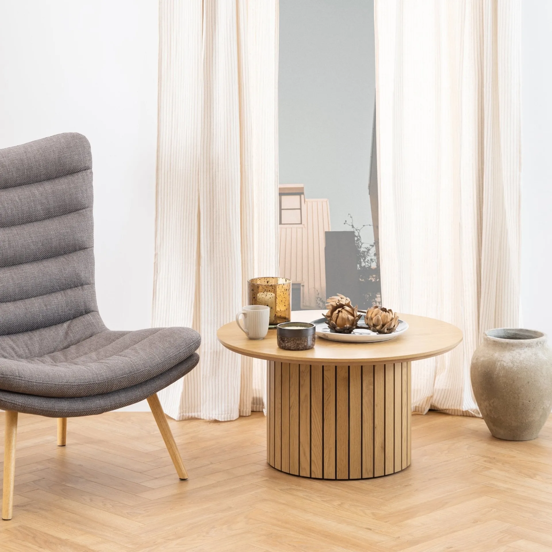 Let og elegant lamel sofabord – rundt i egelook