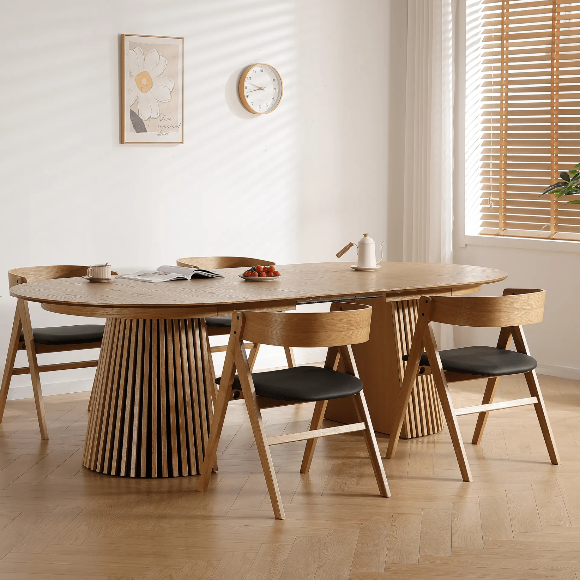 Det her bord rammer en perfekt balance mellem stil og funktion. Den ovale bordplade i egefiner giver et blødt og indbydende udtryk, mens de markante lamelfødder sætter et moderne og karakterfuldt præg på rummet.