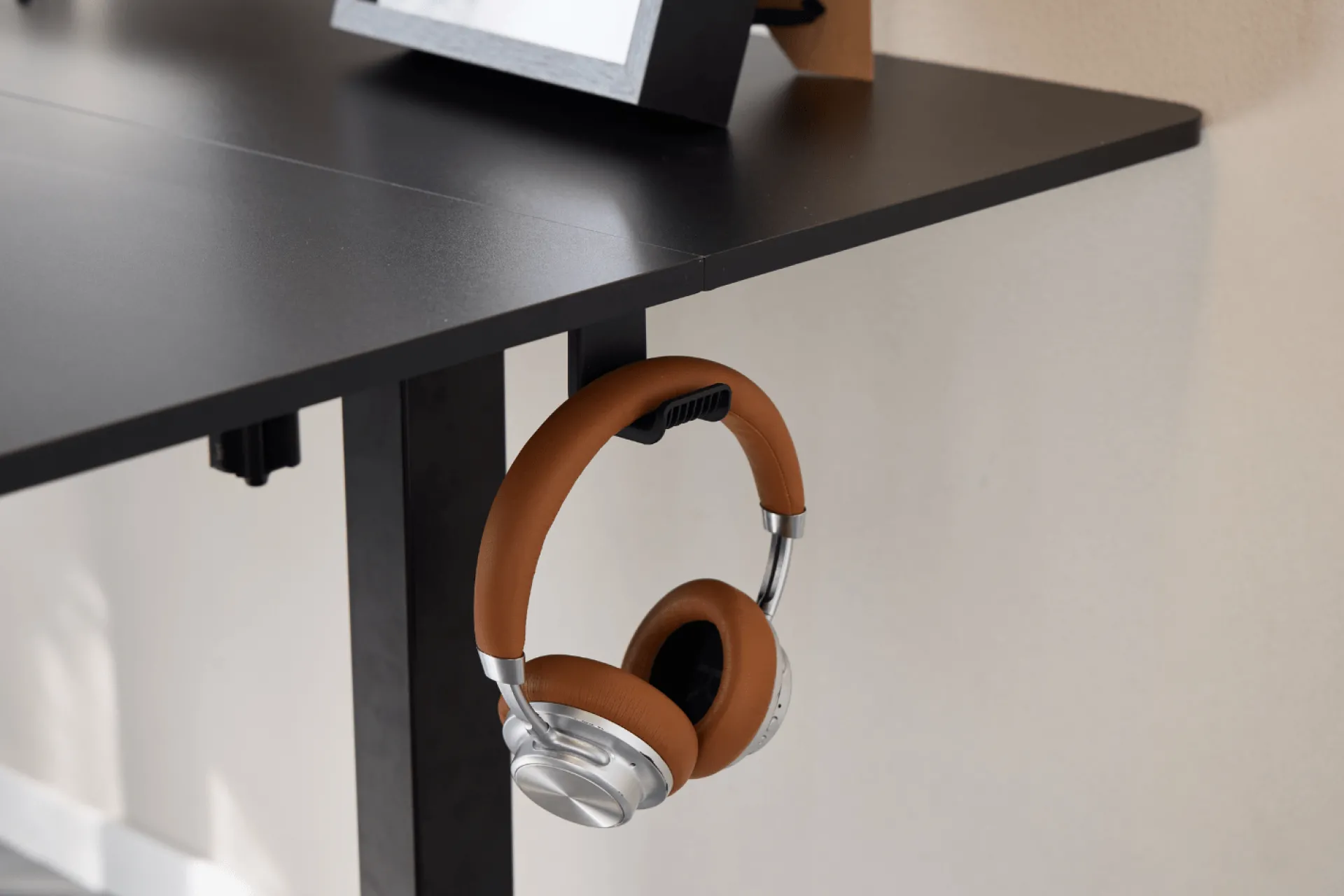 Den stilrene bordplade i sort kunstfiner hviler på en stærk stålramme, som giver et let og moderne udtryk, der passer ind både i hjemmekontoret og på arbejdspladsen. Overfladen er slidstærk, ridsefast og nem at rengøre, så dit bord bevarer sit pæne udseende i mange år.