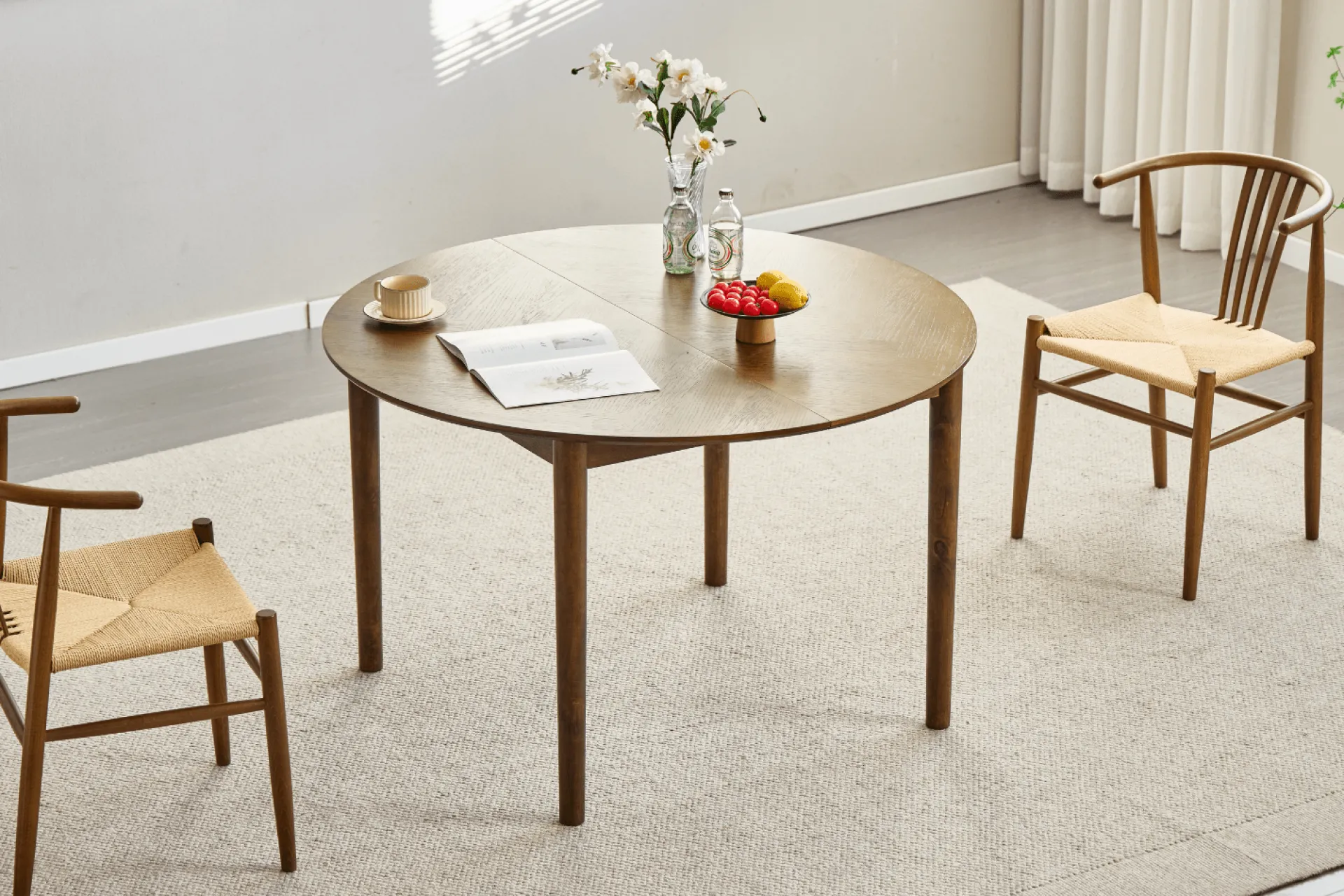 Rundt spisebord med udtræk og sildebensmønster