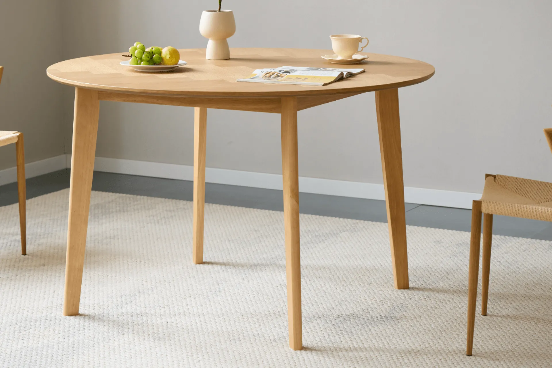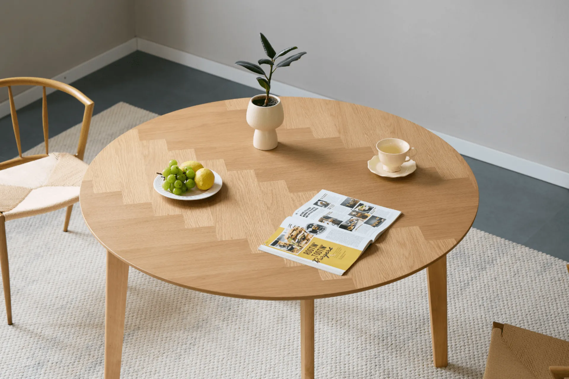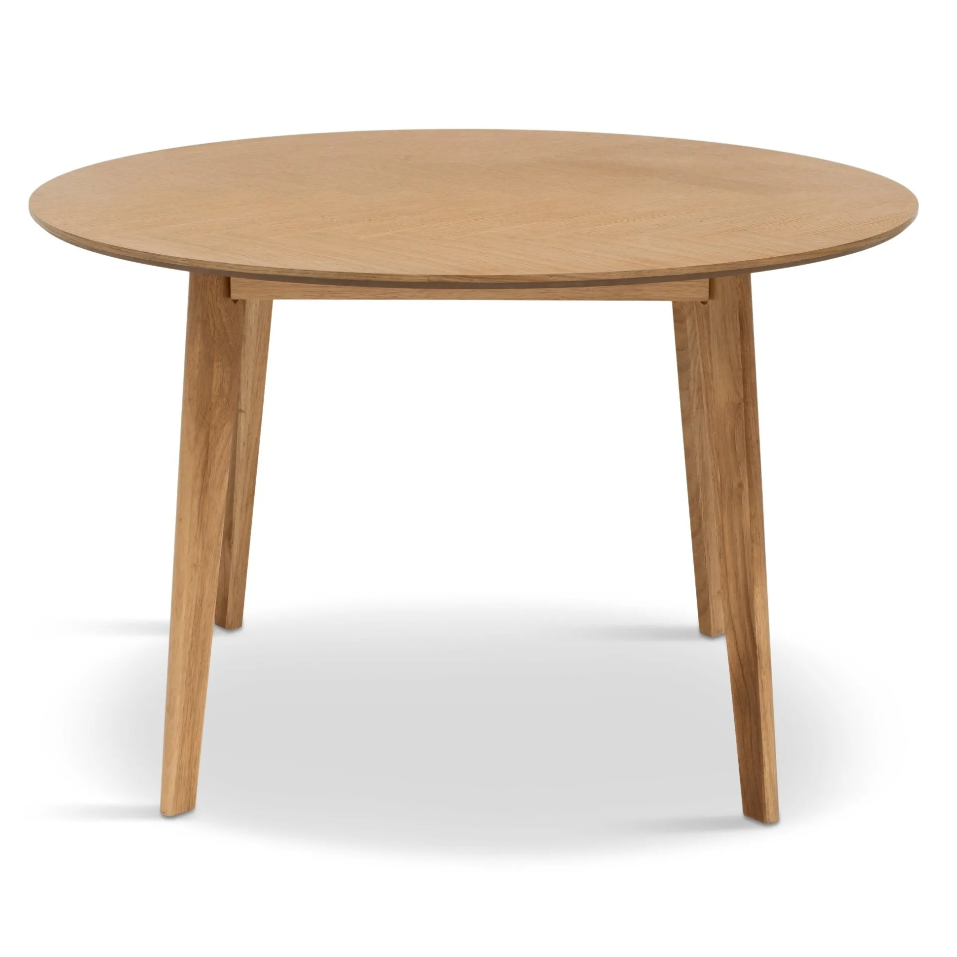 Et elegant og tidløst rundt spisebord med flot sildebensmønster, der giver bordpladen karakter og et eksklusivt udtryk. Med en diameter på 120 cm er der god plads til hyggelige måltider og nærvær med familie og venner.