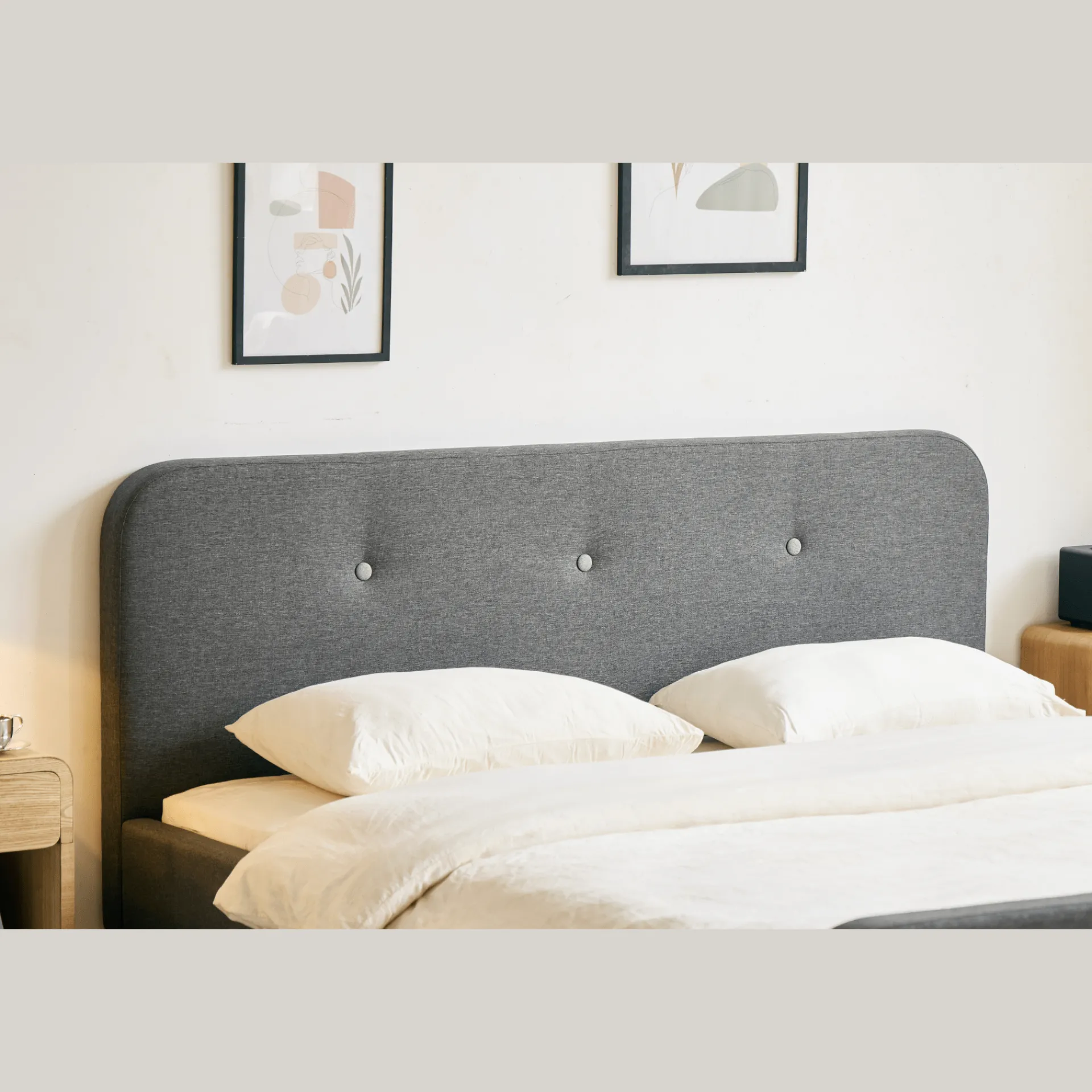 Giv dit soveværelse et stilrent og moderne udtryk med denne sengeramme med knapdetaljer. Sengerammen er betrukket med behageligt tekstil og står stabilt på solide træben, der giver et naturligt og skandinavisk præg til udtrykket.
