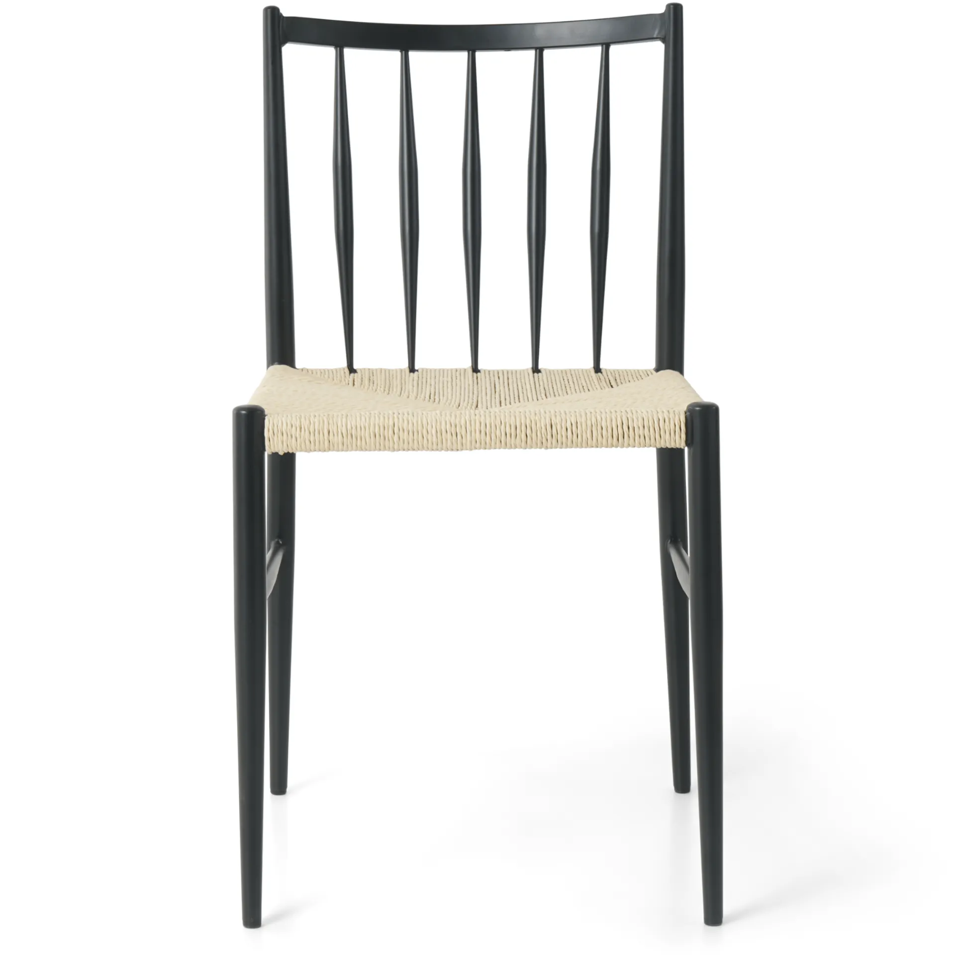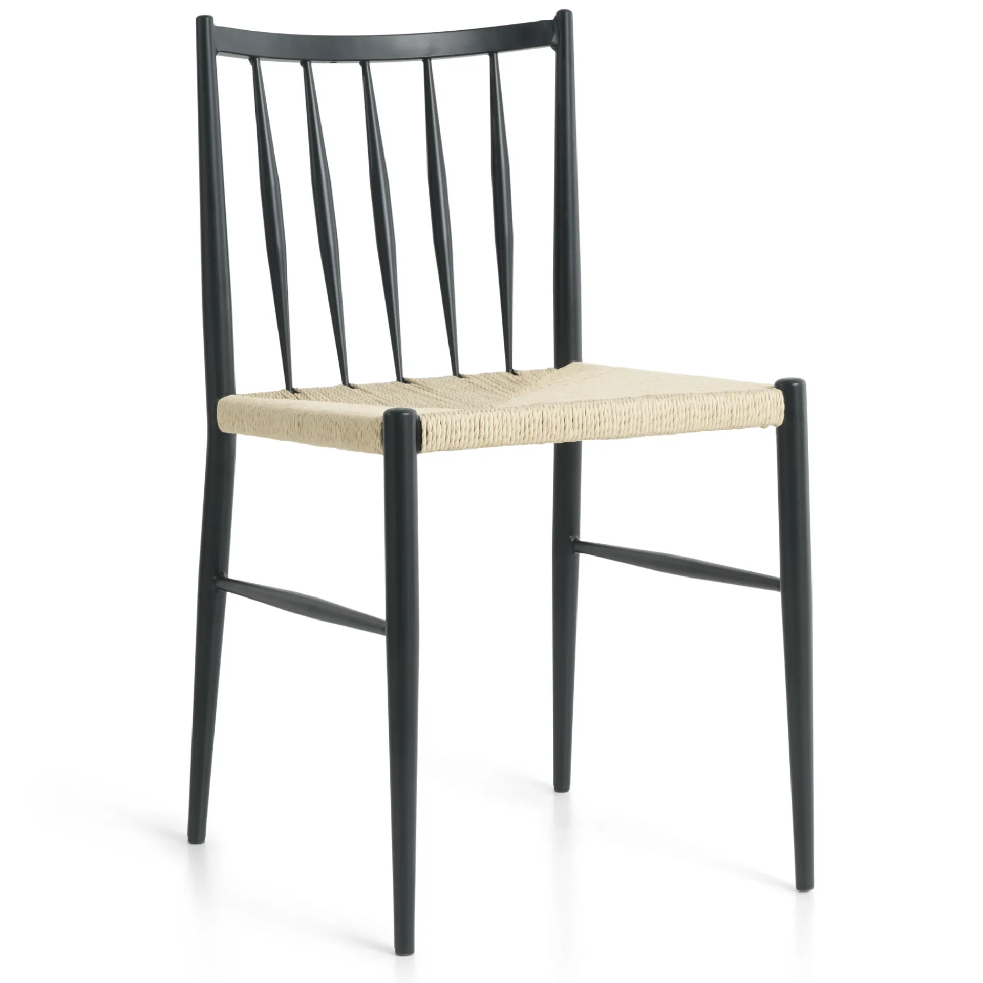 Tilføj et klassisk touch til dit hjem med denne stilfulde spisebordsstol, der kombinerer moderne design med tidsløse materialer. Stolen har en robust ramme i sortlakeret metal, slanke ben og et ryglæn, som giver god støtte.