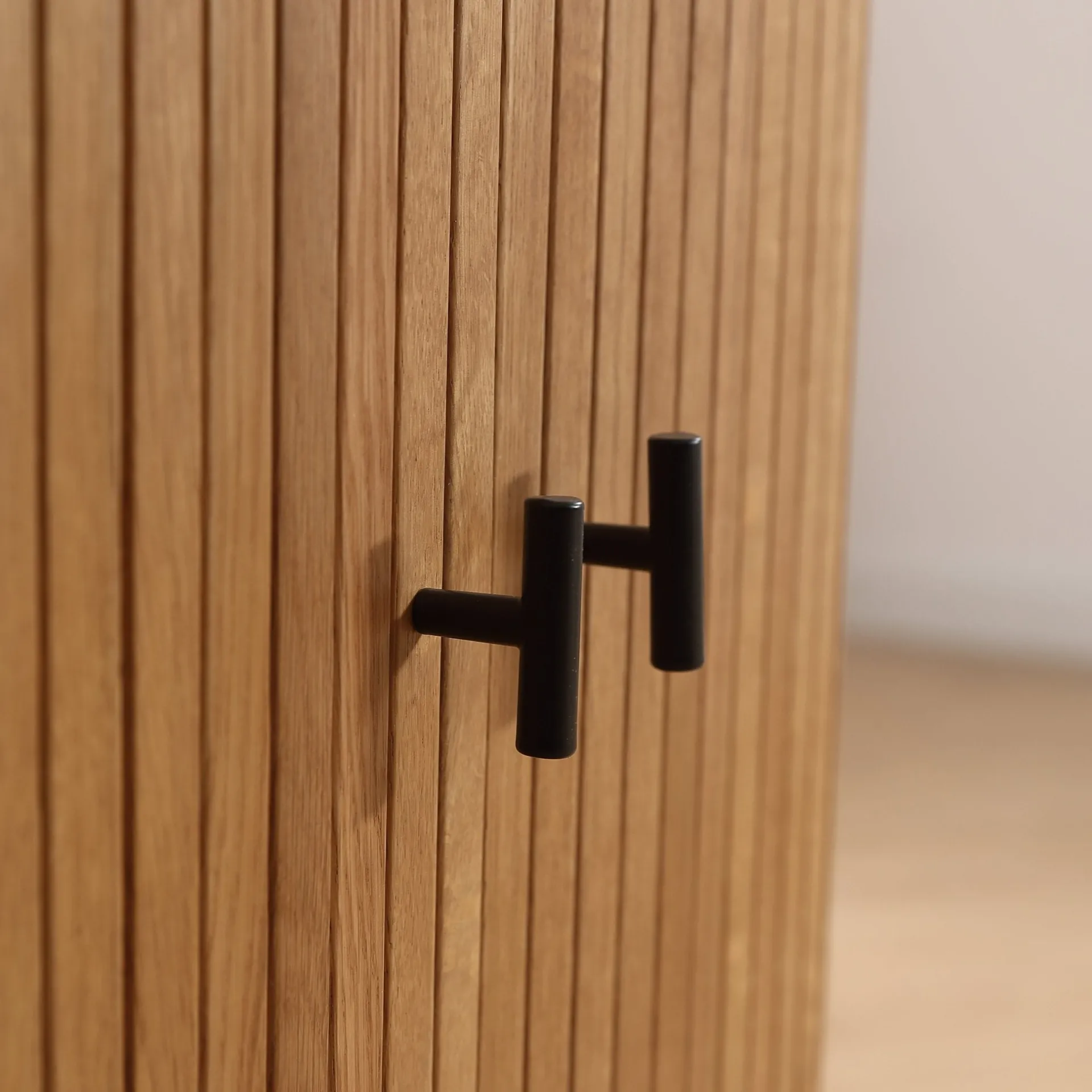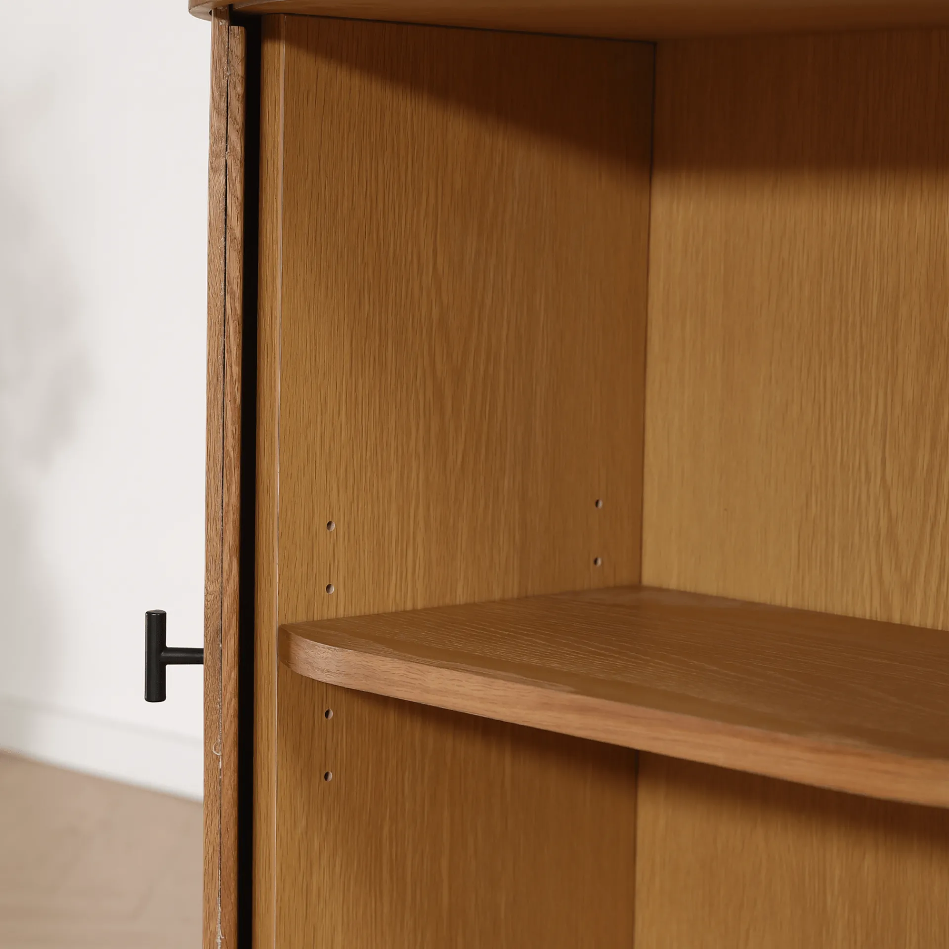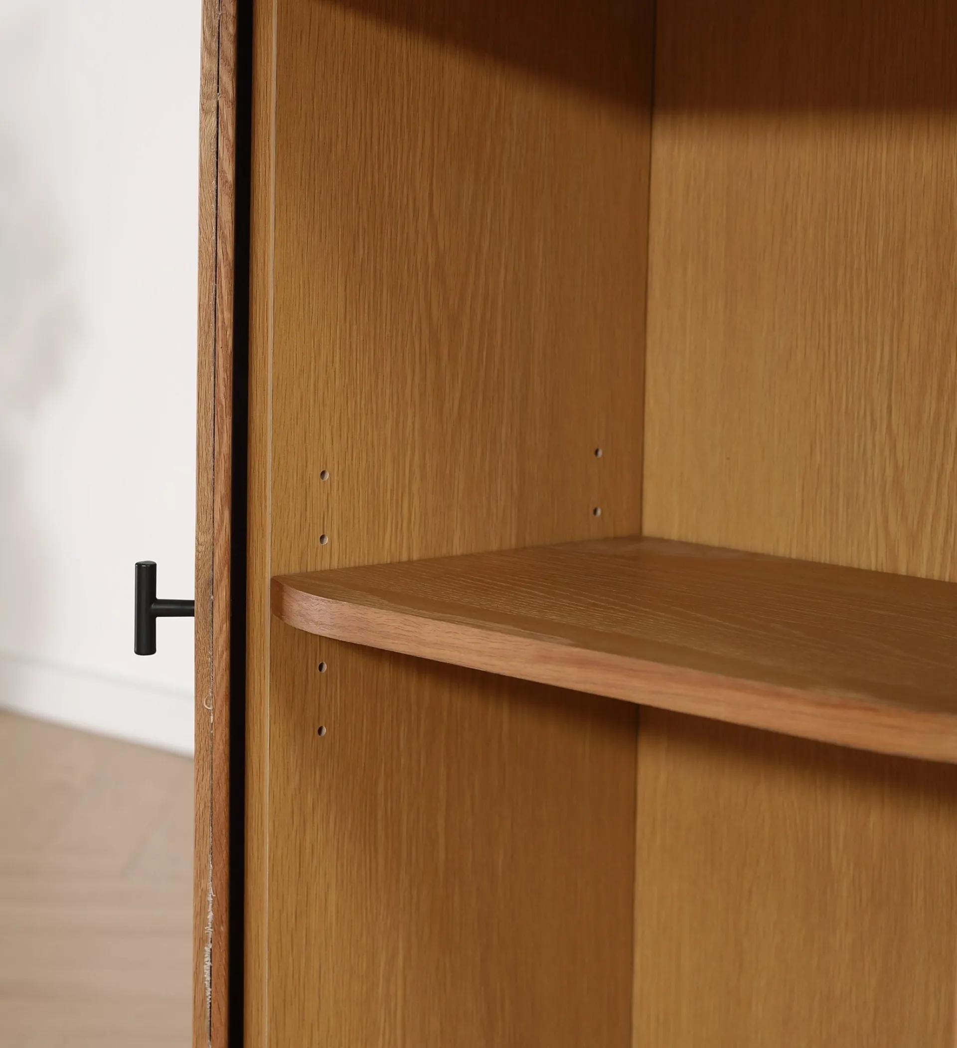 Skabet har praktiske jalousi-låger, der ikke kun tilføjer et stilfuldt touch, men også gør det nemt at åbne og lukke skabet uden at optage ekstra plads. Det fine håndværk og den lyse egetræ fremhæver de naturlige træstrukturer, hvilket gør skabet til et iøjnefaldende møbel i både stuer, soveværelser og entreer.