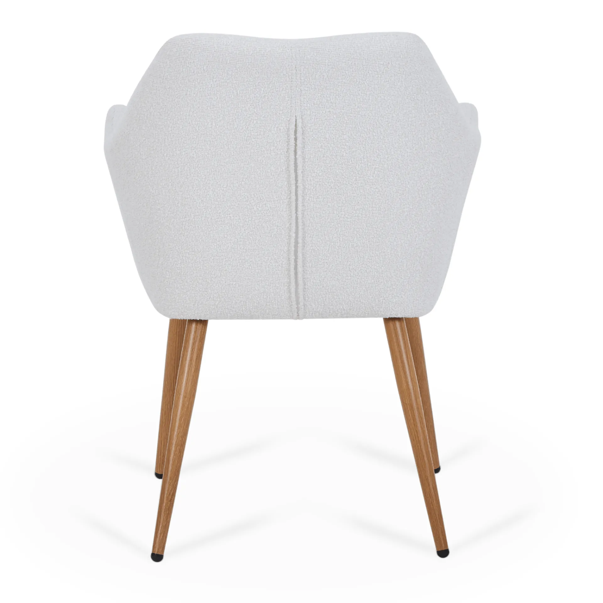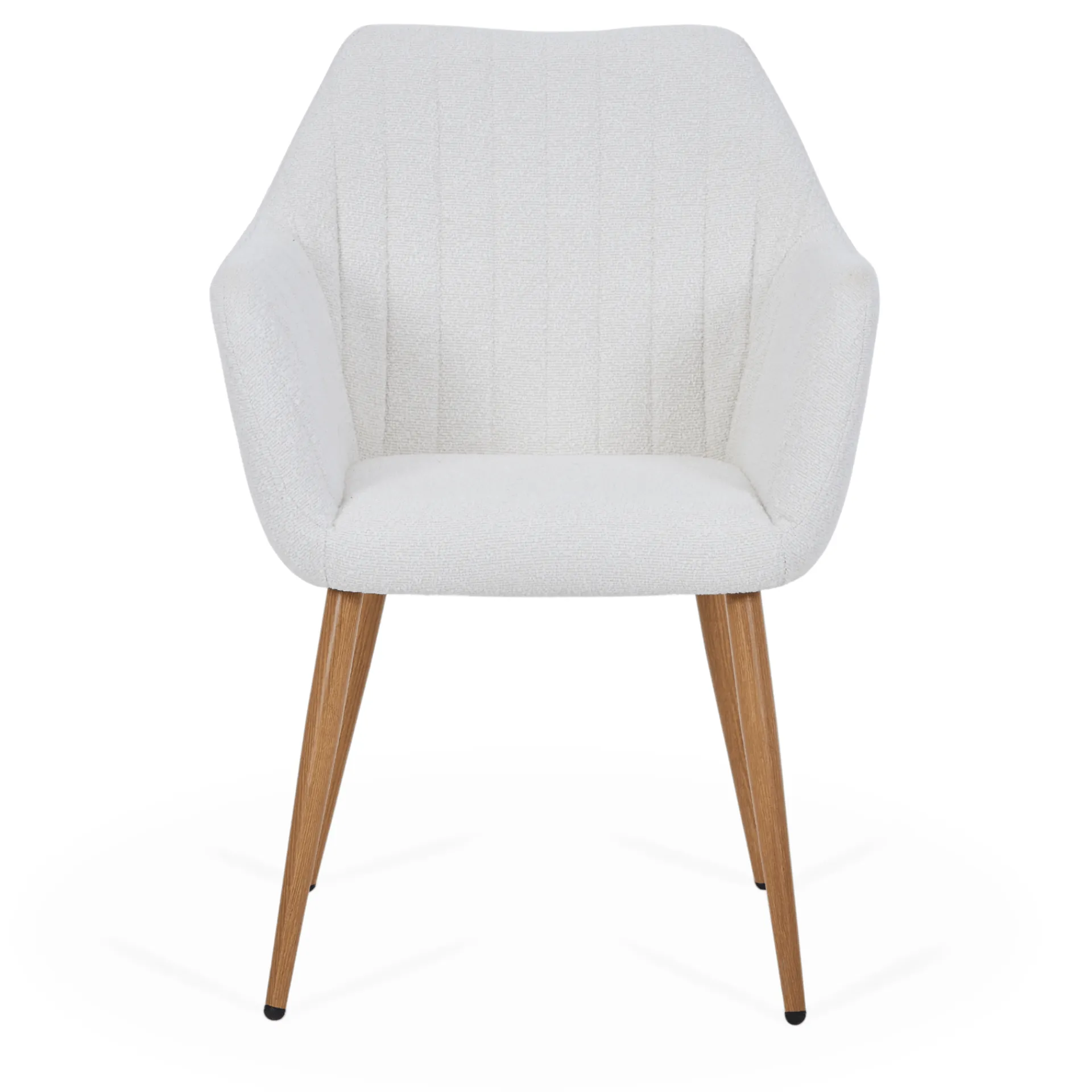 Vanessa spisebordsstol i hvidt boucle med armlæn er en smuk og komfortabel stol, der vil bringe liv og farve til ethvert spisebord eller kontor. Dens bløde hvide boucle føles lækkert mod huden, mens armlænene giver ekstra støtte og komfort. Stolens robuste stel i egelook og solid base sikrer stolens styrke og holdbarhed. Hvis du leder efter en varm og komfortabel spisebordsstol, er Vanessa spisebordsstol i hvidt boucle med armlæn et fremragende valg.