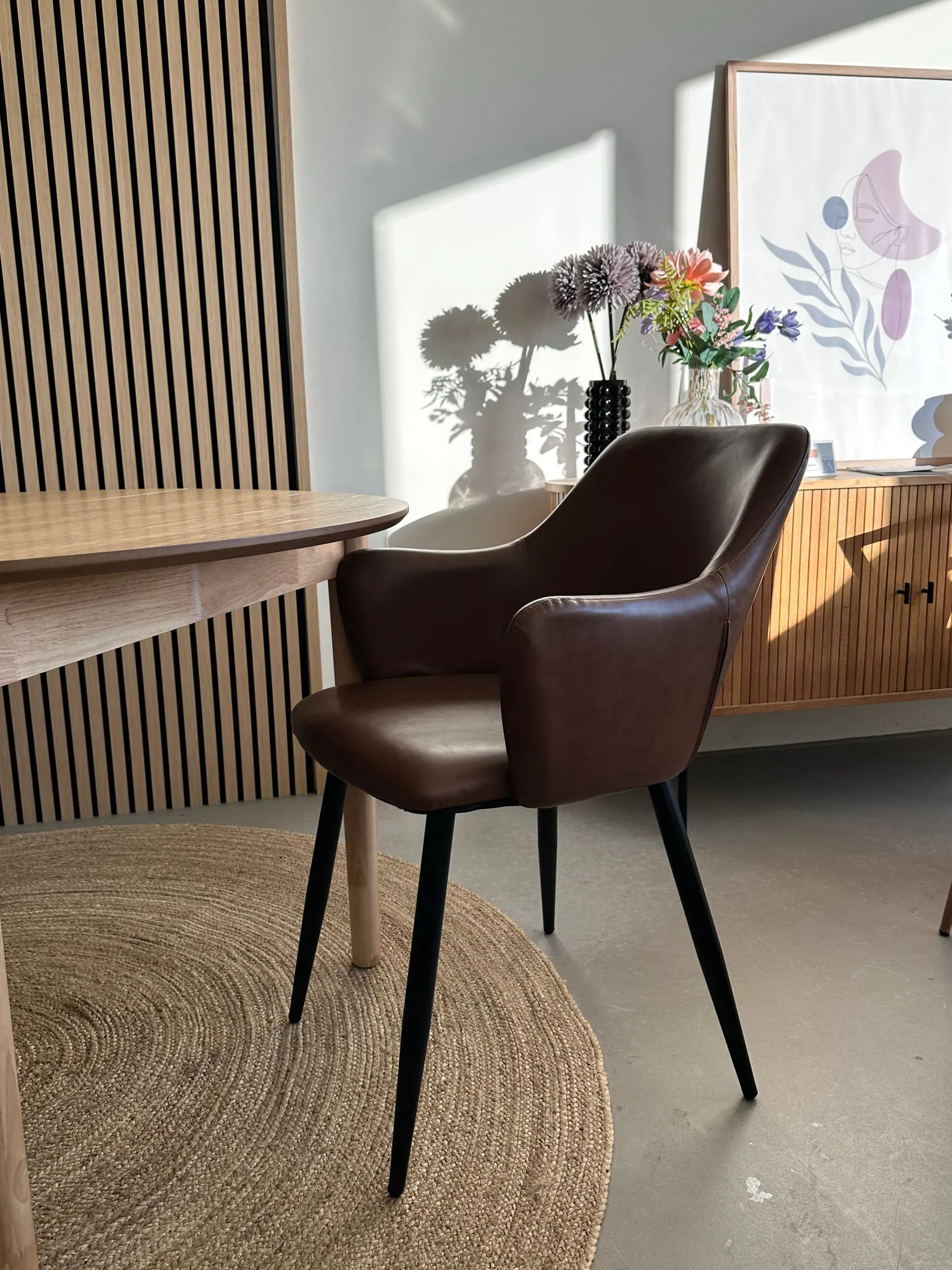Opgrader din spisestue med vores stilfulde spisebordsstol i brunt kunstlæder. Denne stol kombinerer stil og komfort i et moderne design, der passer perfekt til både daglig brug og særlige lejligheder.