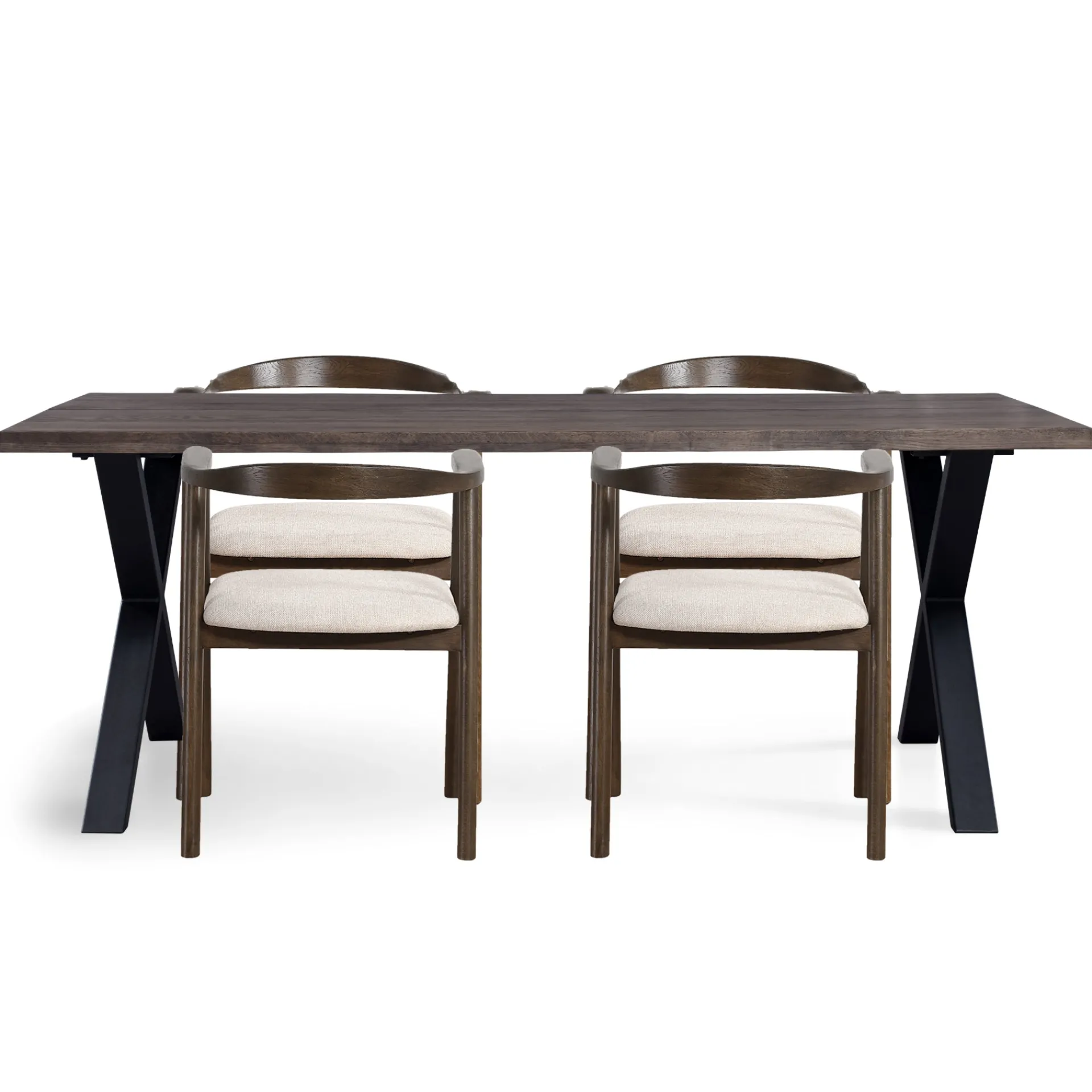 Spisebordssæt – Susan plankebord i røget eg 200 cm + 4 x Jocelyn spisebordsstole i røget eg med beige polstrede sæder