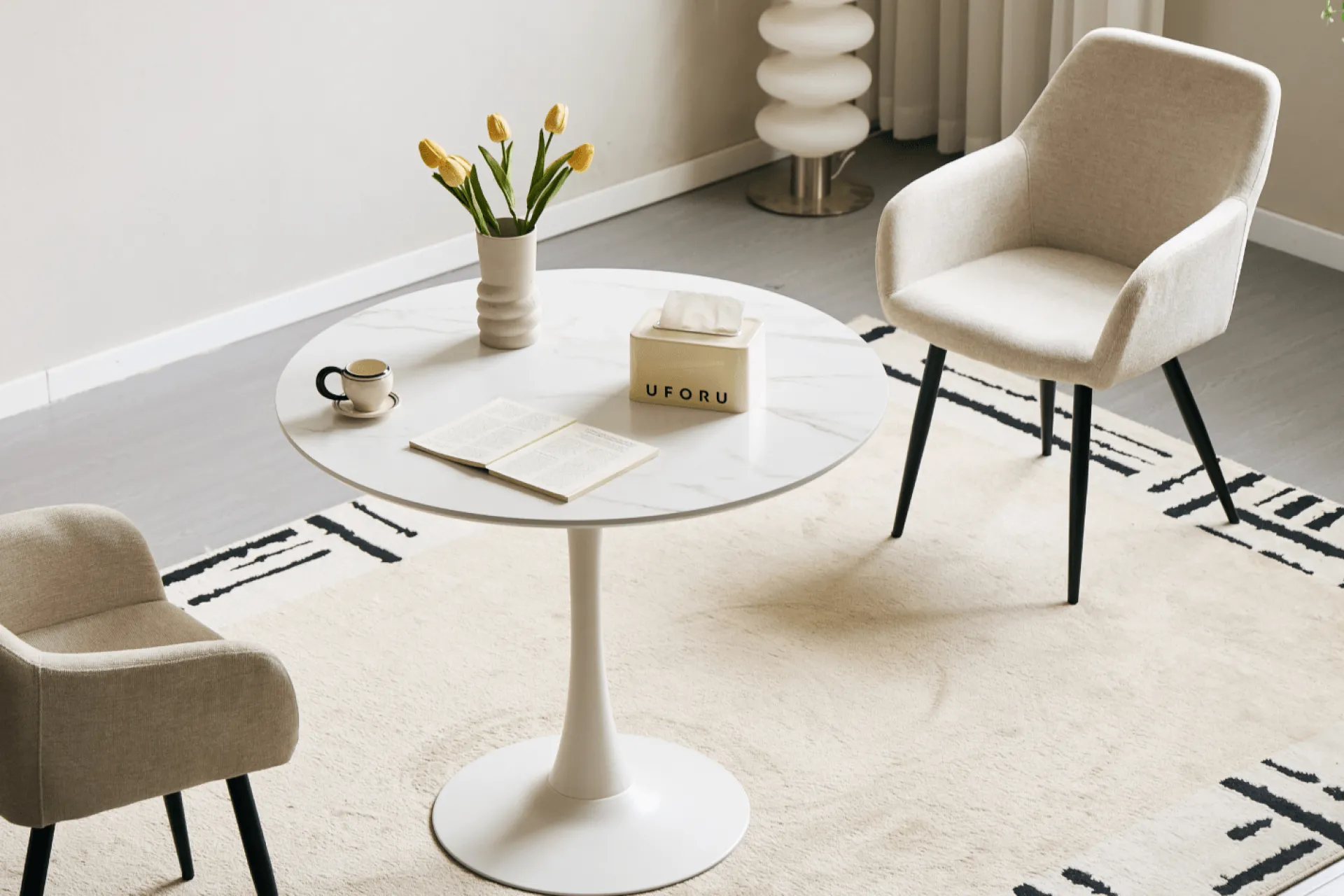 Dette elegante spisebord er det perfekte valg til mindre spisestuer og hjem, der ønsker at tilføje et strejf af luksus og stil. Bordet har en rund bordplade med hvidt marmorlook.