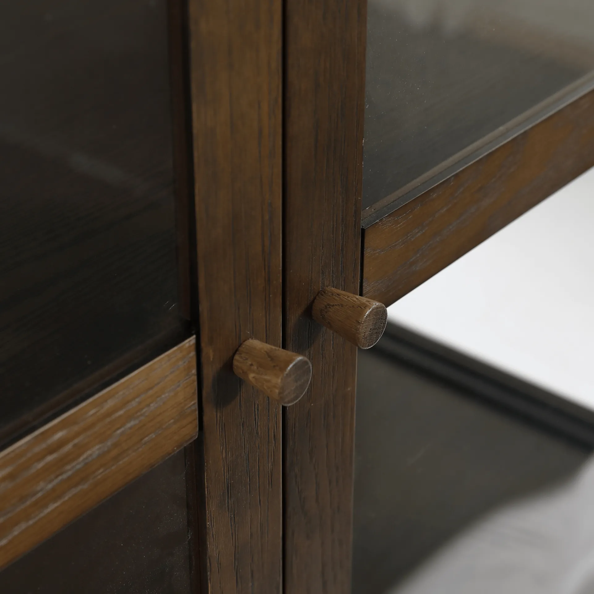 Det røget egetræ giver en smuk kontrast i hjemmet og tilføjer varme og karakter til rummet. Med magneter, der sikrer, at lågerne lukkes diskret og sikkert, er Havana vitrineskabet både praktisk og stilfuldt.