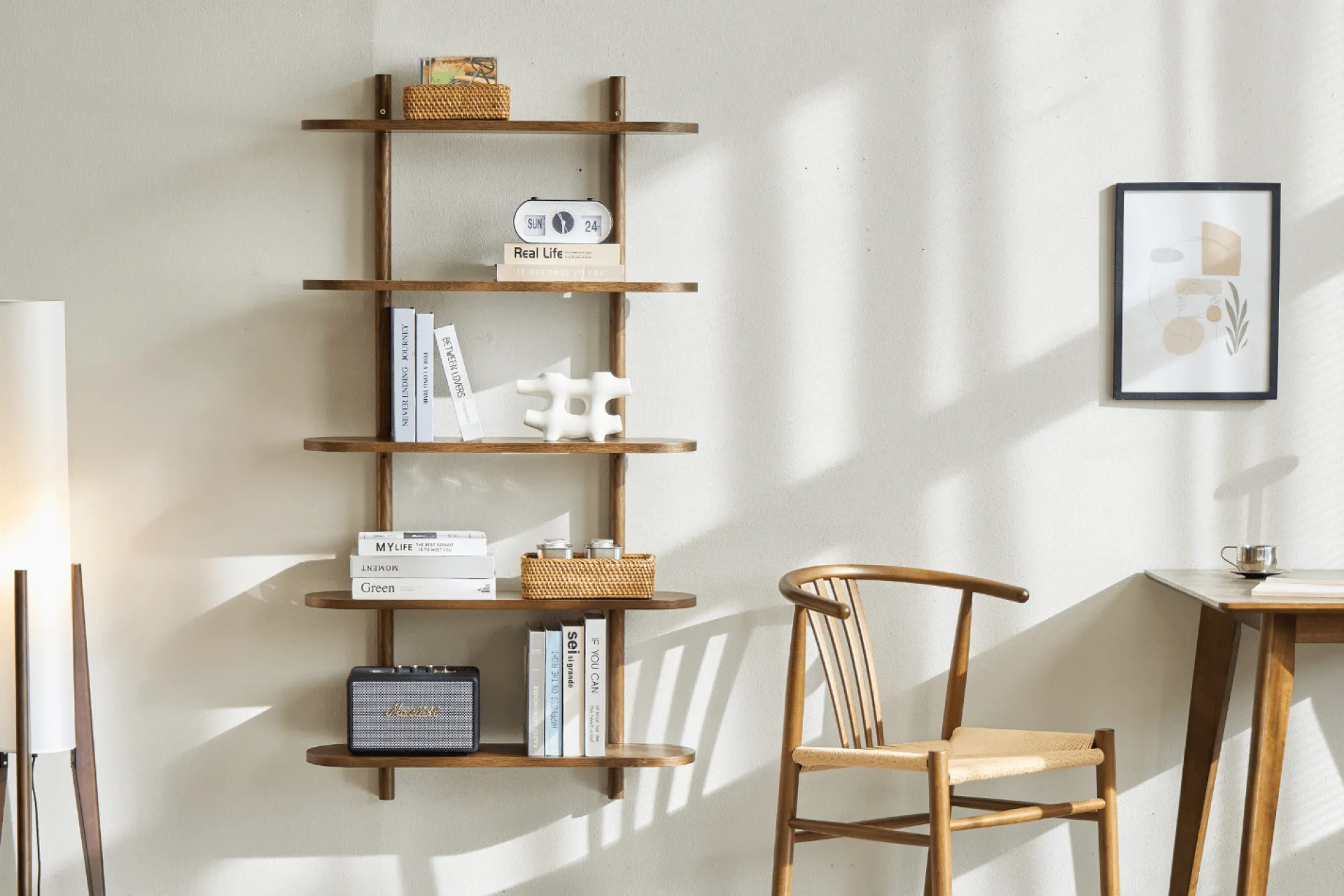 Skab et elegant og roligt udtryk i hjemmet med Juliet væghylde. De fem rummelige hylder giver dig god plads til at udstille dine yndlingsdekorationer, bøger og billeder, mens det minimalistiske design med bløde, afrundede hjørner og den naturlige egetræsoverflade tilfører varme og karakter til rummet. Juliet væghylde kombinerer funktionalitet og æstetik, perfekt til dig, der ønsker et enkelt og stilrent hjem.