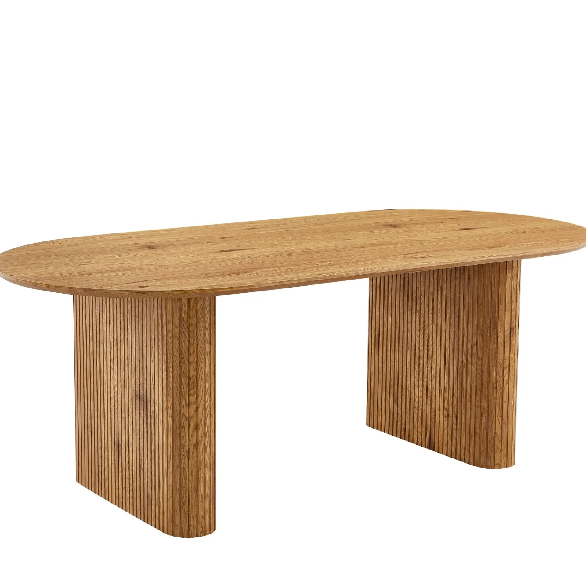 Dette spisebord kombinerer funktionalitet og stil med sin elegante ovale bordplade og solide fod. Bordet fås i to smukke farver: røget eg og naturlig egelook, hvilket passer ind i de fleste indretninger.