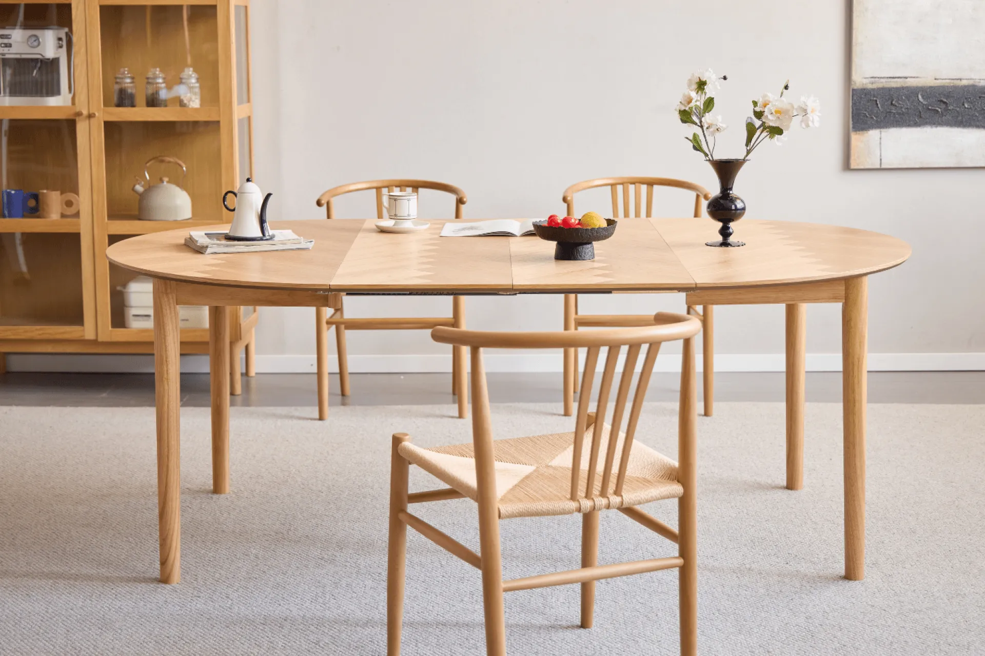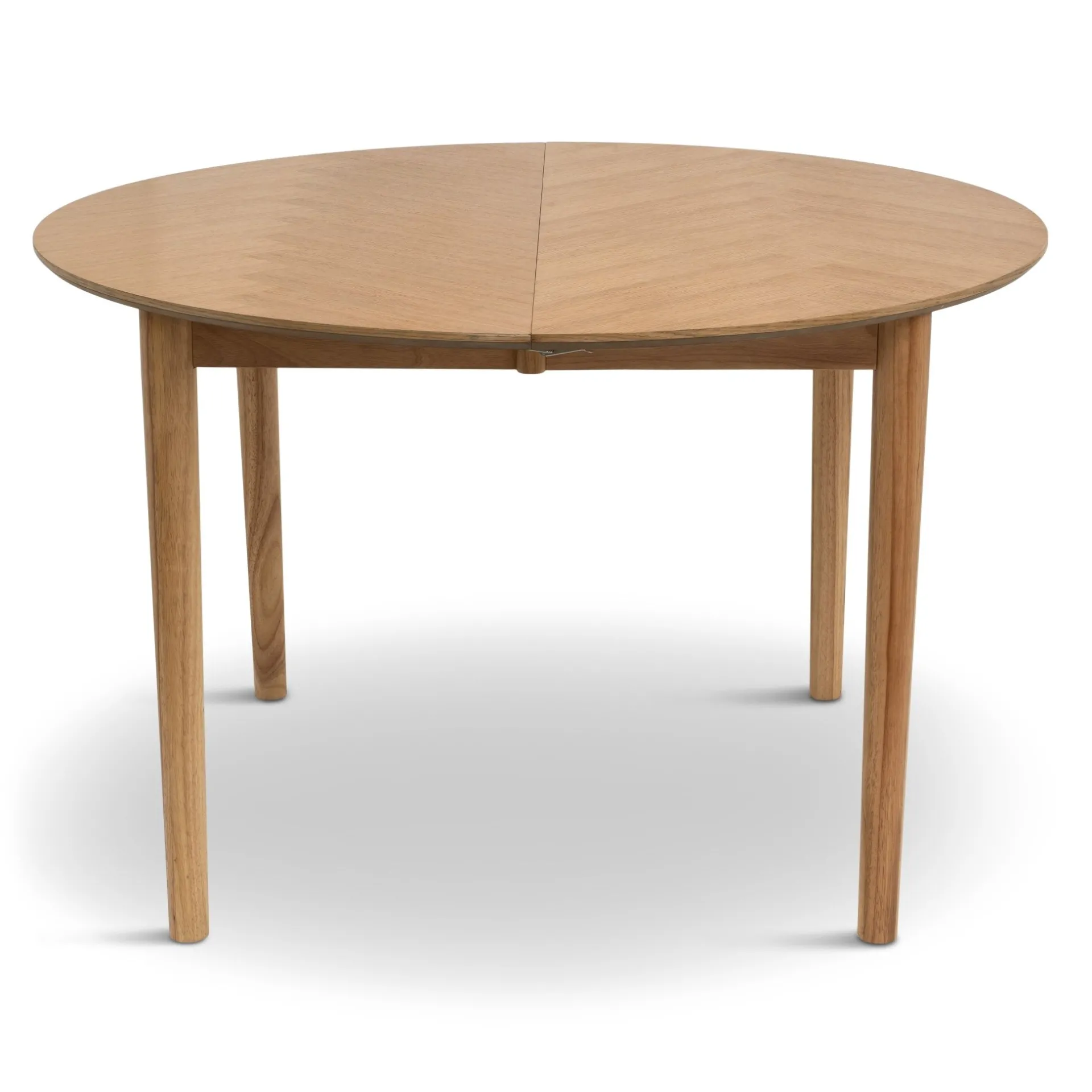 Rundt spisebord med udtræk og sildebensmønster