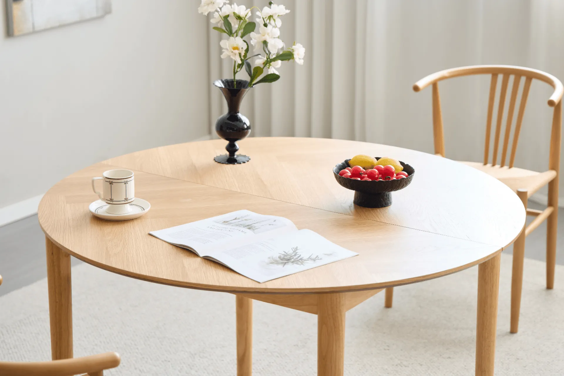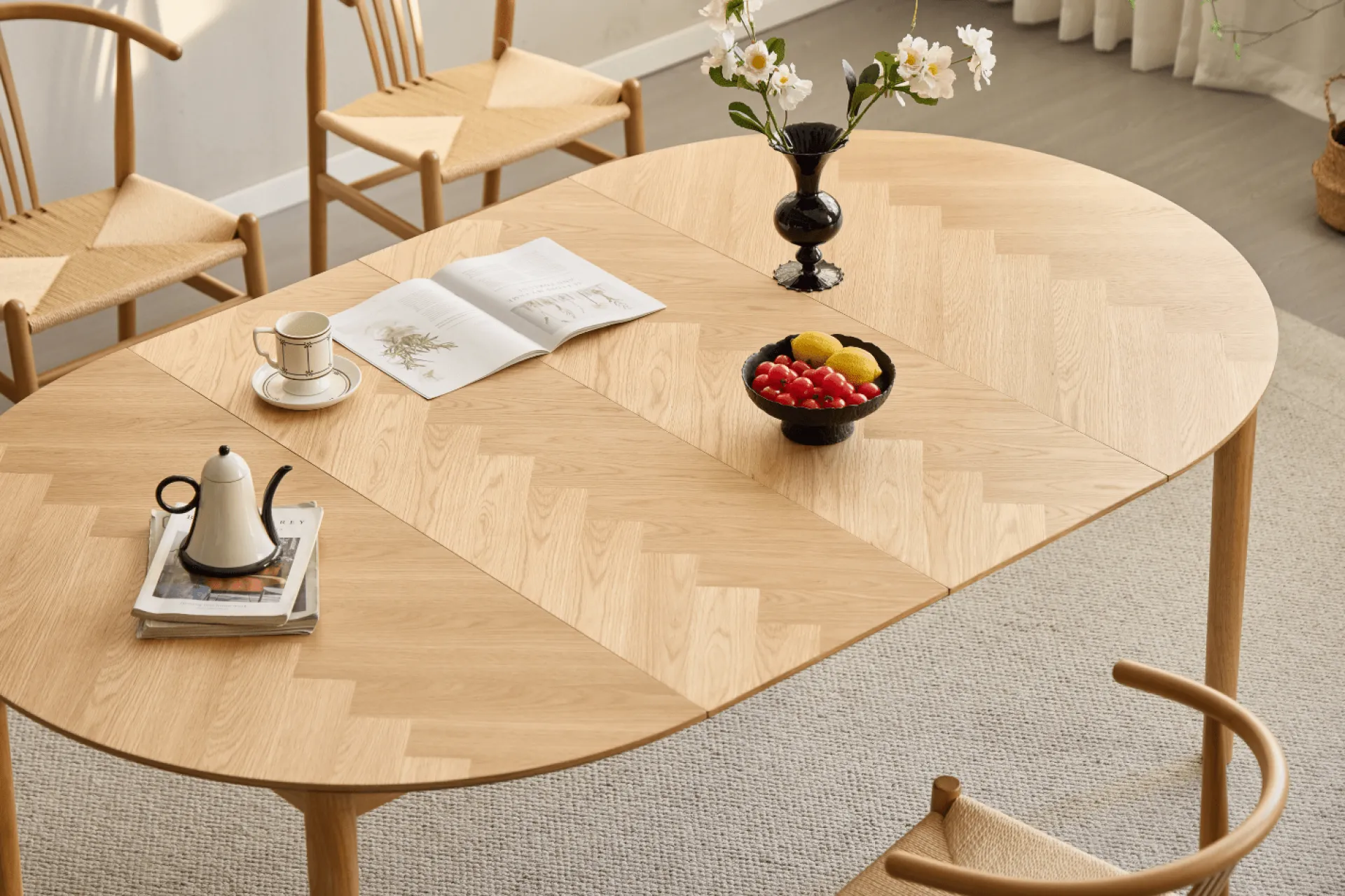 Et stilrent og funktionelt spisebord med klassisk sildebensmønster og bløde former, der inviterer til hyggelige måltider og nærvær. Bordet måler Ø120 cm i sammenklappet tilstand og rummer nemt fire personer.